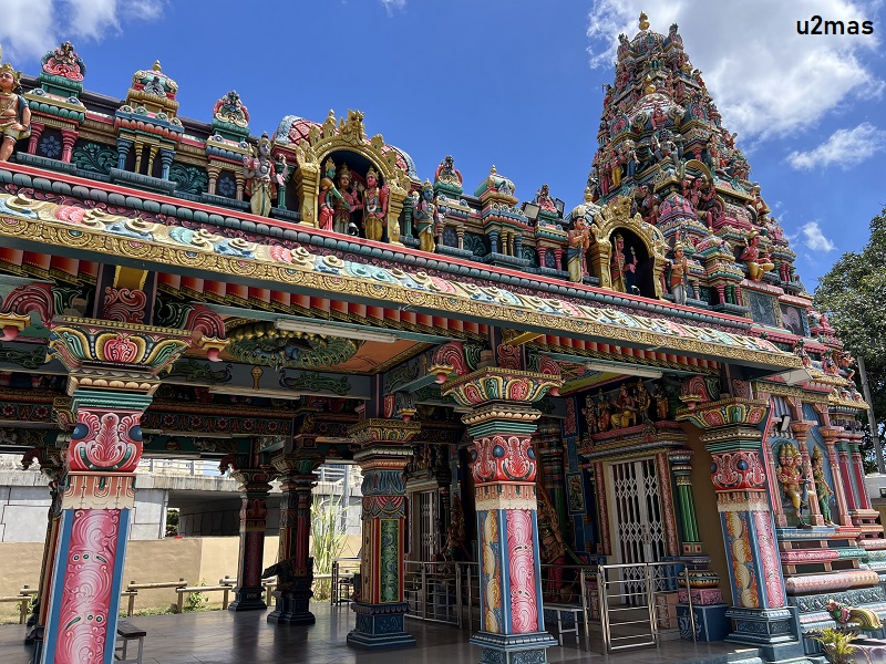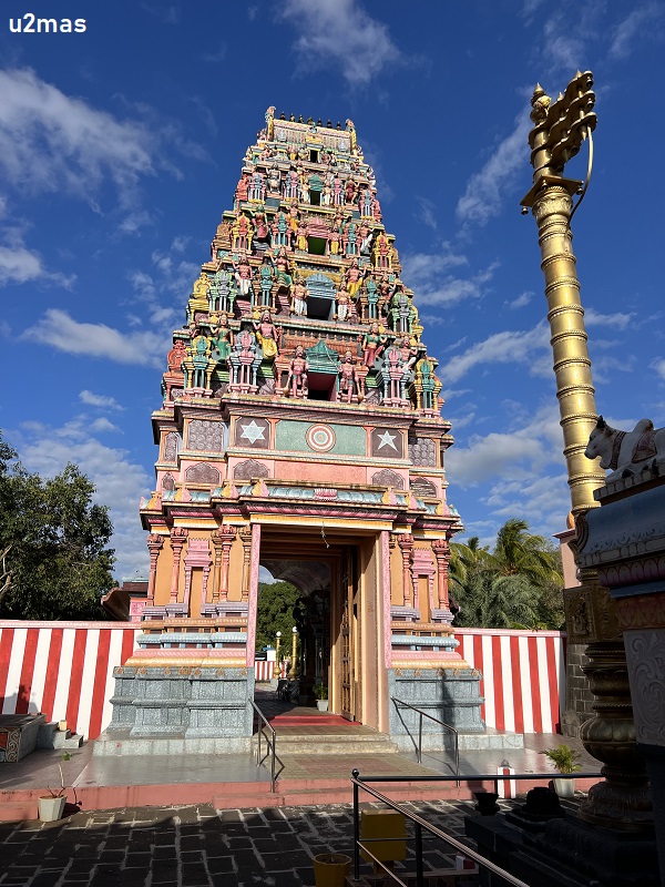 El siguiente paso nos llevaría a parar en dos templos hindúes tamiles, hacia el sur de la ciudad, que pudimos localizar gracias a Google Maps. El primero, llamado Kaaliyammen Thirukkovil, no era muy grande y contaba con un edificio principal recién pintado. Nos animaron amablemente a visitarlo con la única obligación de descalzarse. El segundo, Madurai Mariamen, nos gustó bastante más, bien cuidado y con más nivel de detalle en cuanto a relieves y policromías. Se encuentra junto a la autovía M-1 que cruza la ciudad, y ya le habíamos echado el ojo el primer día que pasamos por allí, volviendo de Flic en Flac. También hubo que descalzarse y ambos eran gratuitos, pudiendo hacer ofrendas.