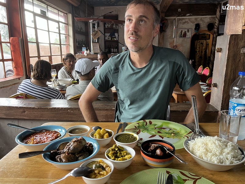 Se trata de una zona volcánica, en el que se crean varias dunas de tierra entre la abundante vegetación de los alrededores, y donde pueden verse hasta siete tonos diferentes, de ahí su nombre. Está muy cuidado, cuenta con un recinto con tortugas propias de la isla, sección de plantas endémicas, un bar, una tienda y baños. Por supuesto, ya sea a la ida o la vuelta (es una carretera sin salida), hay que parar en el mirador de la cascada de Chamarel, una impresionante caída de agua de 100 metros, que pudimos apreciar gracias a la tregua que nos dio el tiempo. Regresamos al pueblo de Chamarel, famoso por su oferta gastronómica, encontrando el “Palais de Barbazon”, un sitio auténtico con menú del día, compuesto por cuencos de pollo, cerdo, pescado, arroz y hasta cinco legumbres, todo muy especiado y rico. El precio, 1.475 MUR=31,38 € los dos.