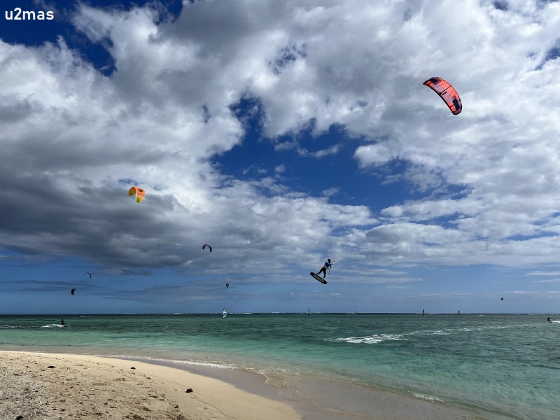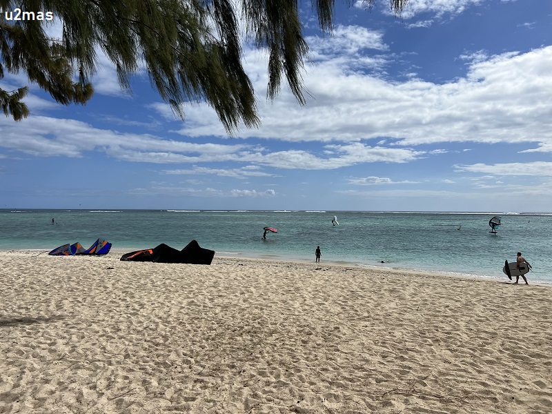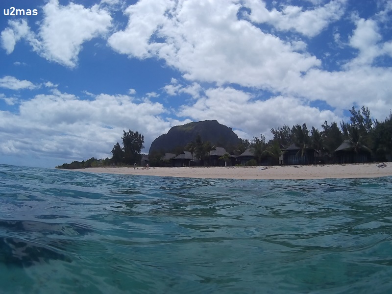 Una vez allí, enseguida se ve que los hoteles de lujo abundan, buscando el área señalizada de la playa pública, con aparcamiento de sobra. Pasamos la mañana entre esta playa y la de la esquina suroeste, ambas públicas, con aguas muy transparentes, aunque no tan buenas para el buceo con tubo como las anteriores (casi todo arena), pero bien a gusto, eso seguro. En la segunda se pueden conseguir buenas fotos desde el agua y con Le Morne de fondo, así como disfrutar de la cantidad de gente que practica deportes acuáticos de viento, como kite-surf o windsurf, al tratarse de una zona ideal para ello.