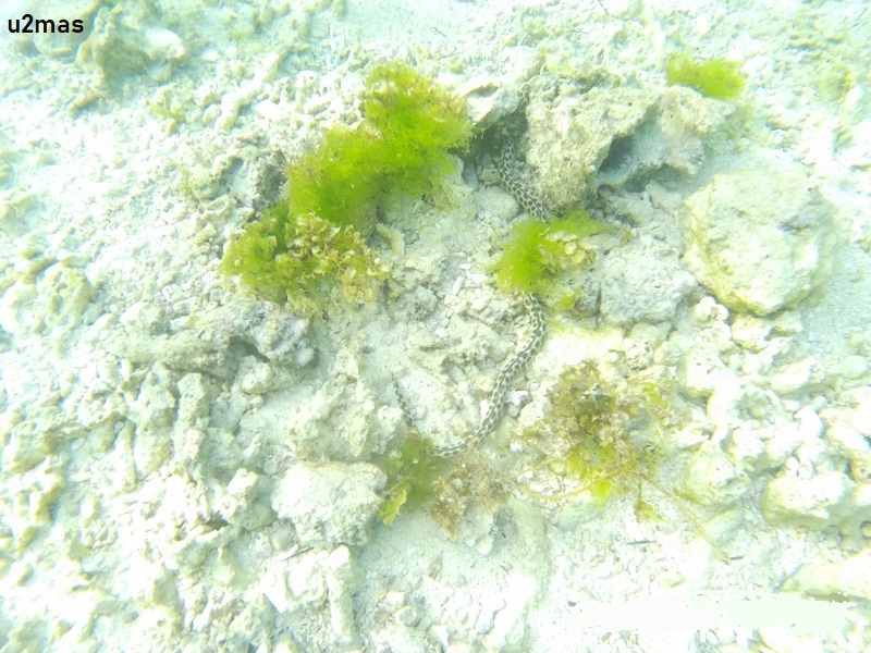 El resto de la mañana fue estar entre la arena y el agua, buceando con tubo lo más próximo al arrecife que pude. Hay que tener especial cuidado con los barcos, ya que primero suele haber una zona señalizada de baño, pequeña y que no es buena para bucear, y justo a continuación y paralelo a la costa, un canal por el que las embarcaciones salen y entran a la playa provenientes de la salida a mar abierto. Es en este punto donde crucé rápido y atento, pasando enseguida la boya que lo marca y buceando tranquilamente, pues además a medida que te acercas al arrecife hay menos profundidad y los barcos no se meten en la zona. En cualquier caso, las embarcaciones suelen pasar despacio sabiendo que puede haber bañistas, pero mejor prevenir.