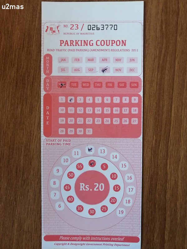De vuelta al coche, avanzamos hasta la capital de la isla, Port-Louis, de la que estábamos a apenas 15 kilómetros desde Moka. La primera parada fue en el punto elevado de la ciudad, la Citadelle, donde se ubica el Fort Adelaide. Es gratuito y destaca por sus vistas del conjunto urbano y el puerto, está bien conservado por fuera pero poco aprovechado por dentro, sin nada que ver. De allí bajamos a la sencilla catedral de Saint-Louis, también gratis. Comentar que los aparcamientos del centro son de pago, debiendo adquirir un cupón en quioscos o tiendas de comestibles (siempre se puede preguntar dónde es posible si no se ven), que según el precio da para más o menos tiempo, debiendo marcar manualmente los datos, tal y como se ve en la foto. Nosotros compramos uno de 20 MUR=0,42 €, válido para 30 minutos.