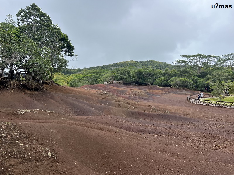 La lluvia arreció y tuvimos que pasar de puntillas por el Grand Bassin, un área con lagos y templos hinduistas considerado sagrado, teniendo que dejarlo para otro momento. Ya girando a la derecha por la B-103 y dentro del parque nacional Black River Gorges, comenzamos a ganar altitud y la niebla no nos dejó disfrutar de las vistas de los miradores, ni del de las cataratas Alexandra ni el del propio de la garganta (Gorges Viewpoint), obligándonos a volver, pues no hay que perdérselos. La cosa mejoró al empezar a bajar hacia el lado oeste, cruzando Chamarel ya en la carretera B-104, y tomando el desvío para el parque Chamarel 7 Coloured Geopark, que cuesta 550 MUR=11,70 €.