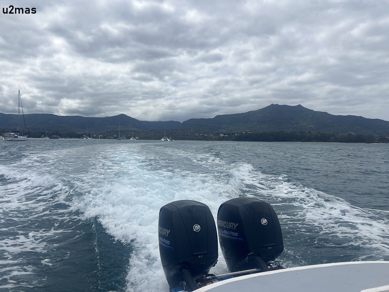 Calculamos bien, sabiendo cómo iba el tráfico a estas alturas, para llegar con tiempo al punto de embarque de la compañía Dolswim, en Grande Riviere Noire, en la costa oeste. Habíamos contratado el tour dos días antes y casi nos quedamos sin sitio, por lo que conviene hacerlo con más antelación. Fue la compañía con mejores opiniones y una diferencia fundamental que explico enseguida, costando 2.500 MUR=53,19 € cada uno. La salida estaba prevista a las 10, y llegamos bien pese a tardar casi 2 horas en hacer 70 kilómetros como mucho.