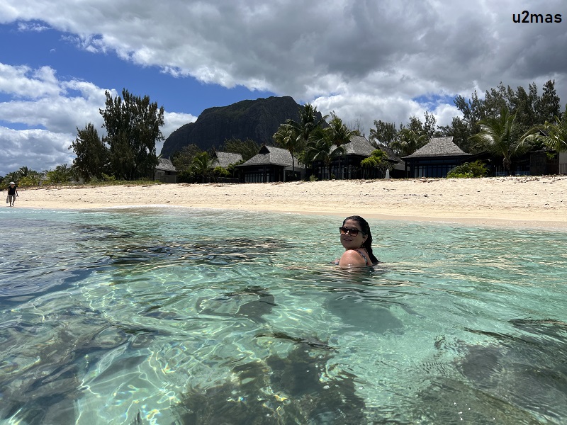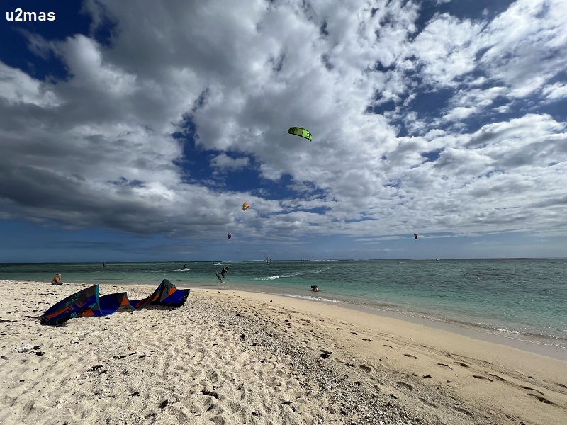 Una vez allí, enseguida se ve que los hoteles de lujo abundan, buscando el área señalizada de la playa pública, con aparcamiento de sobra. Pasamos la mañana entre esta playa y la de la esquina suroeste, ambas públicas, con aguas muy transparentes, aunque no tan buenas para el buceo con tubo como las anteriores (casi todo arena), pero bien a gusto, eso seguro. En la segunda se pueden conseguir buenas fotos desde el agua y con Le Morne de fondo, así como disfrutar de la cantidad de gente que practica deportes acuáticos de viento, como kite-surf o windsurf, al tratarse de una zona ideal para ello.