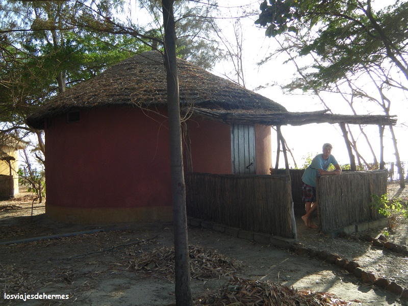 Conocimos este lugar a través de una señora de Pamplona con la que coincidimos colaborando en el orfanato de Dakar y que nos recomendó, son cabañas circulares pequeñas pero que están muy bien, las camas tienen sus mosquiteras y el baño perfecto, aunque sin agua caliente y todo junto al mar y con salida directa a la playa. Tiene una zona común de comedor y la cabaña doble con cena y desayuno (media pensión) nos costó 13.000 CFA=19,81 € a cada uno.