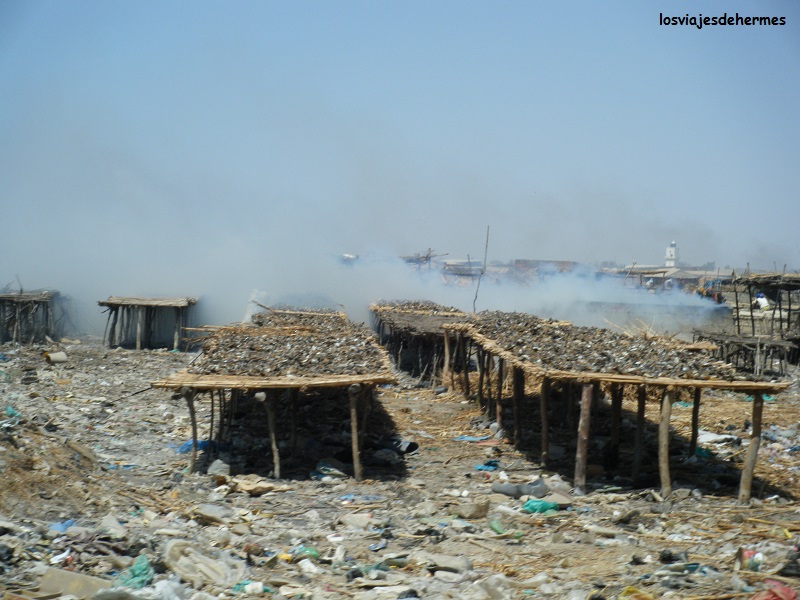 Después de este buen rato volvimos a Joal-Fadiout por la pista principal de tierra naranja (ahora sí), cruzando Sambadia y alguna otra aldea, donde otra vez y sobre todo los niños salían a nuestro paso, está bien pararse y estar con ellos pero enseguida te piden un “kadó” (regalo en wolof) y no es buena idea dar según qué cosas. En nuestro caso les dimos de la comida que llevábamos hasta que nos quedamos sin nada, los que más nos llamaron la atención fueron dos críos de no más de 10 años que cuidaban un rebaño en mitad de ningún sitio y a los que dimos agua, reflexionando sobre lo diferente de tus oportunidades según el sitio donde nazcas. Paramos de nuevo en los ahumaderos de Joal, donde charlamos con una familia que trabajaba allí y pudimos ver de primera mano cómo funciona.