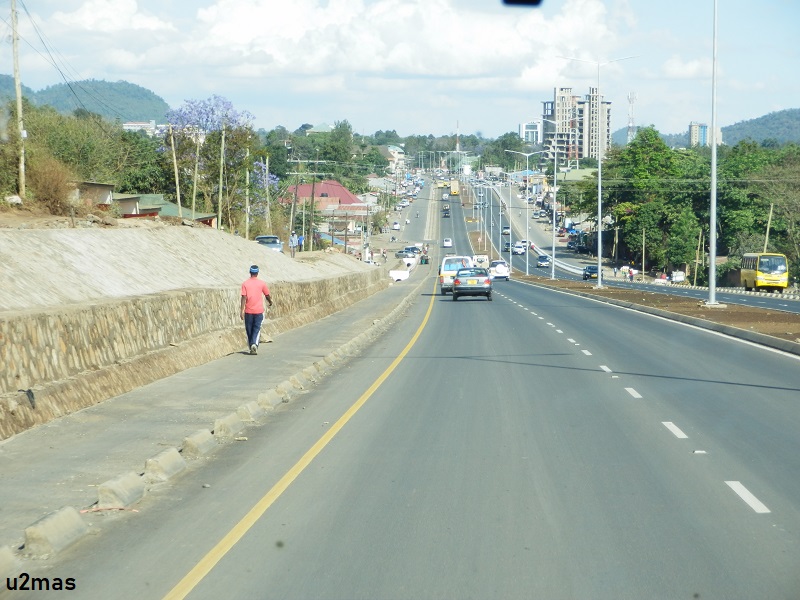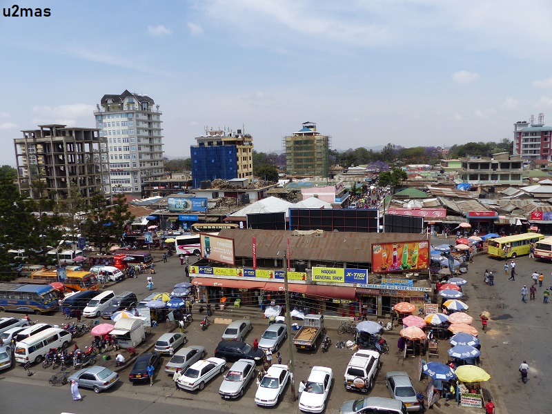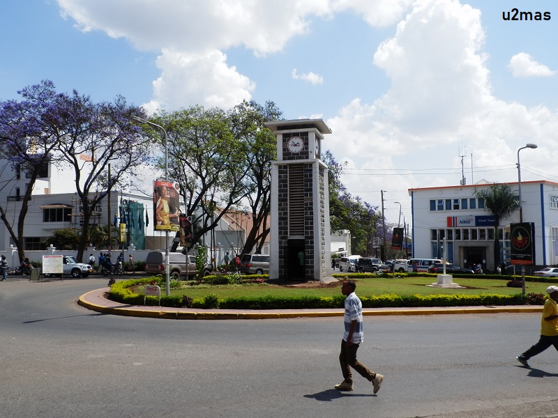 Para llegar a Arusha hubo que quitarse de encima a multitud de taxistas que insistían en llevarnos por otros 50 $, dando al final con el bus lanzadera de la propia compañía aérea, que costaba 10 $=8,55 € y duraba 1 hora. Durante el trayecto tuvimos un primer contacto con el paisaje de sabana con las montañas de fondo, pasando al tráfico caótico africano al entrar en la ciudad. Nos dejó junto a la Torre del Reloj, a unos 15 minutos a pie o mucho menos en taxi (5 $=4,27 €) del hotel.