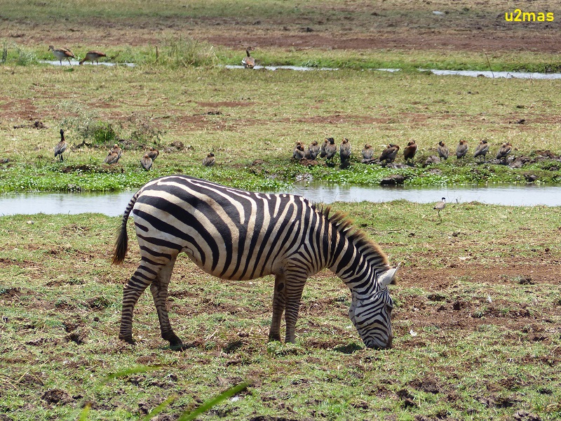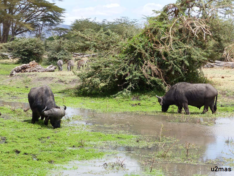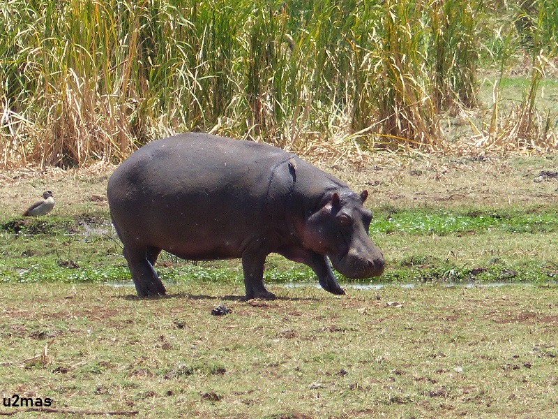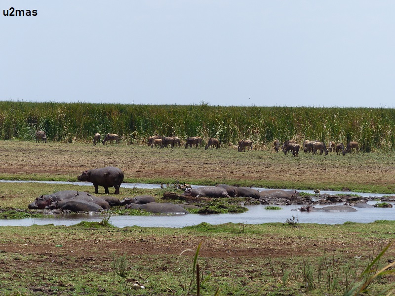 John se conocía a la perfección los caminos, de tierra, parando allá donde era necesario y sin prisas. No tardamos en avistar algunos monos (incluso en el pueblo), y ya con sol y por este orden, fueron apareciendo elefantes, ñus, cebras, búfalos, hipopótamos, jirafas, impalas y un sinfín de aves diferentes. Sin duda los más grandes impresionaban mucho, pasando en ocasiones muy cerca de nosotros, pues tienen prioridad al cruzar. También nos llevó a un pequeño mirador sobre los humedales, desde el que observar los hipopótamos, sobre todo, pudiendo bajar del coche en la parte señalizada. Los animales carnívoros no se dejaron ver en Manyara, por lo que hay que tener paciencia.