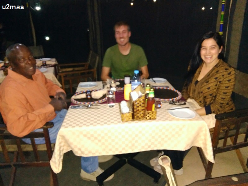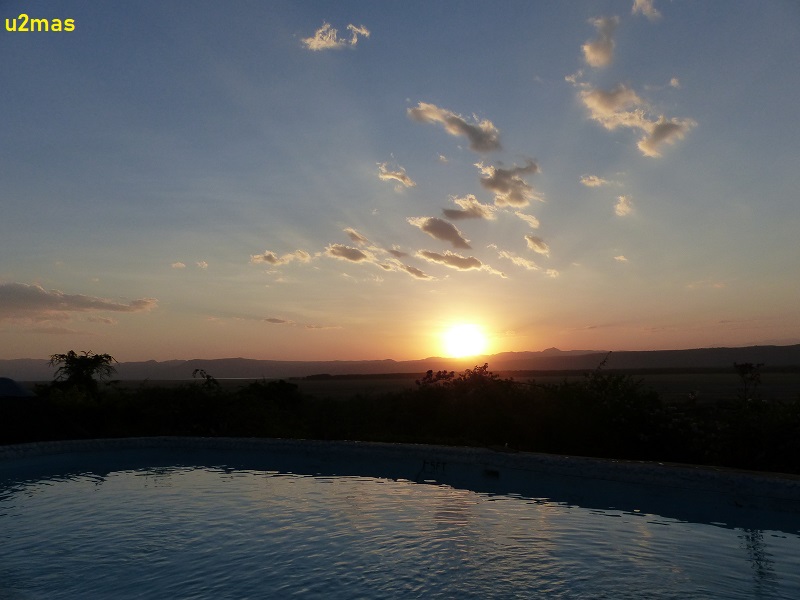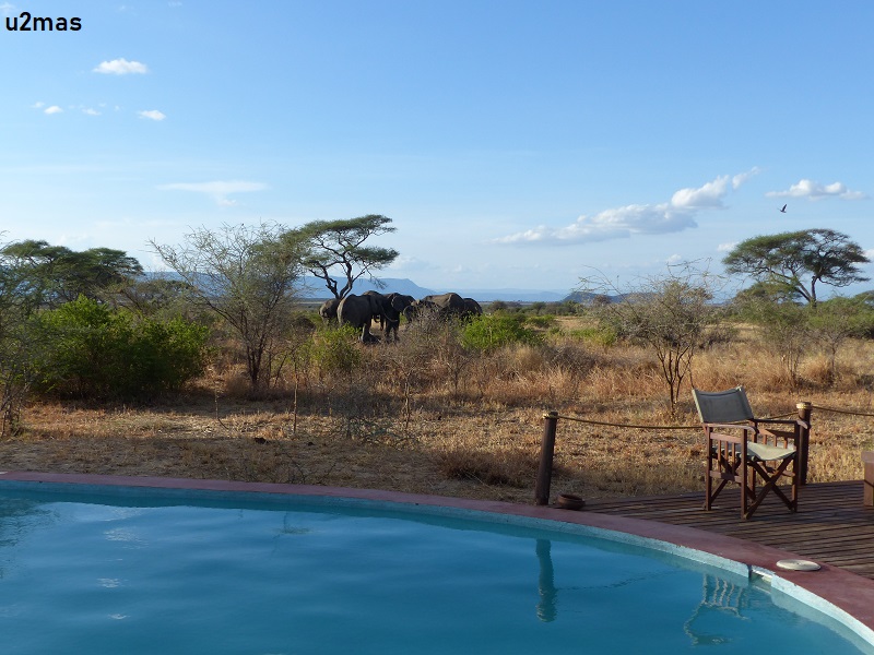 Lo mejor, una piscina con vistas a una charca donde los animales van a beber, lo que proporcionaba vistas a los grupos de elefantes, cebras, ñus o facóceros entre otros, que se avituallaban a pocos centenares de metros mientras nos bañábamos, increíble 😀 . Además, nuestra cabaña era la última, pudiendo ver animales desde el propio porche que iban a la charca, al ser una zona de paso para ello. La cena, siguiendo la tónica general de los anteriores, muy buena, con buffet de entrantes, sopas y varios platos principales, que compartimos junto a nuestro querido guía, John.