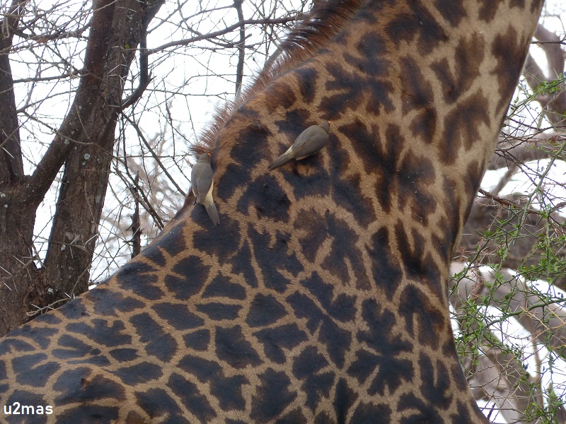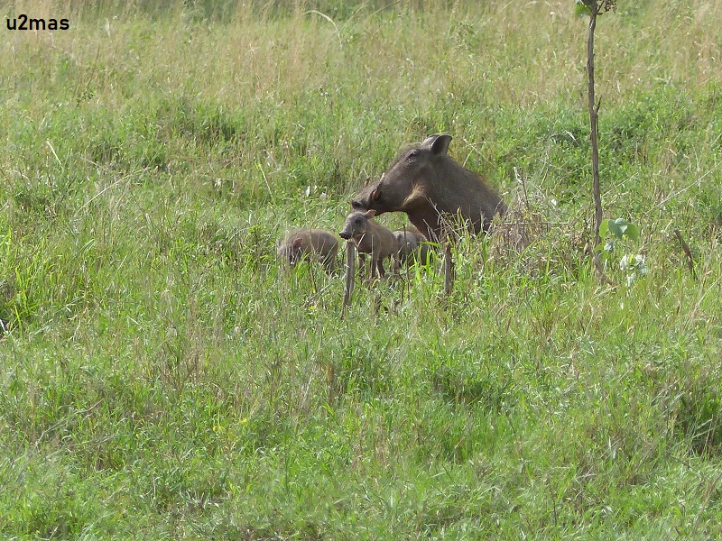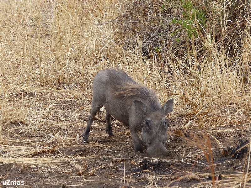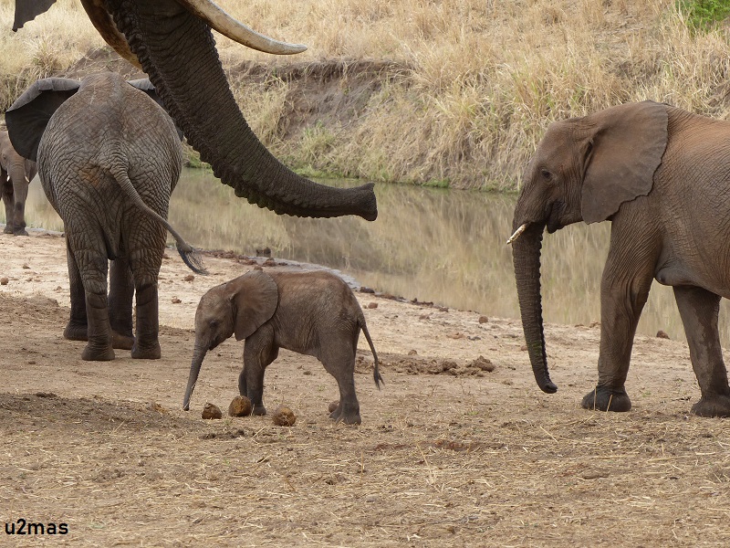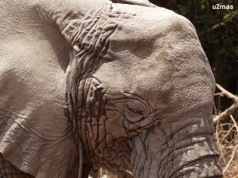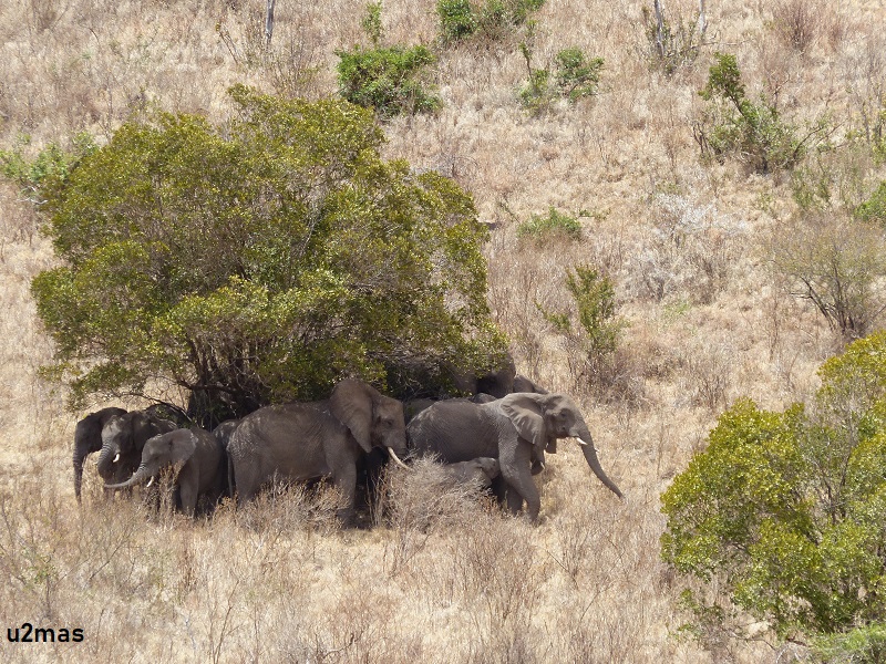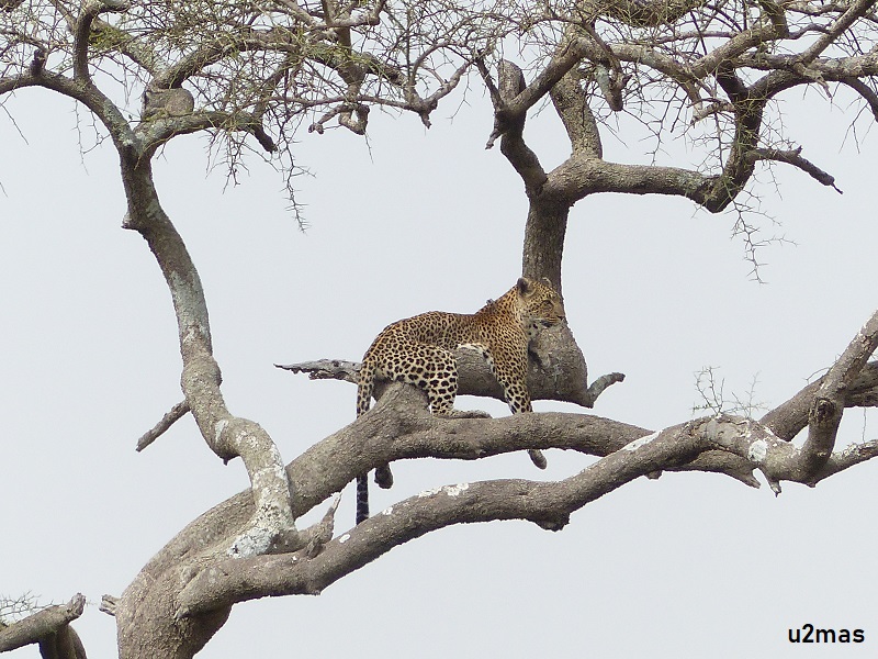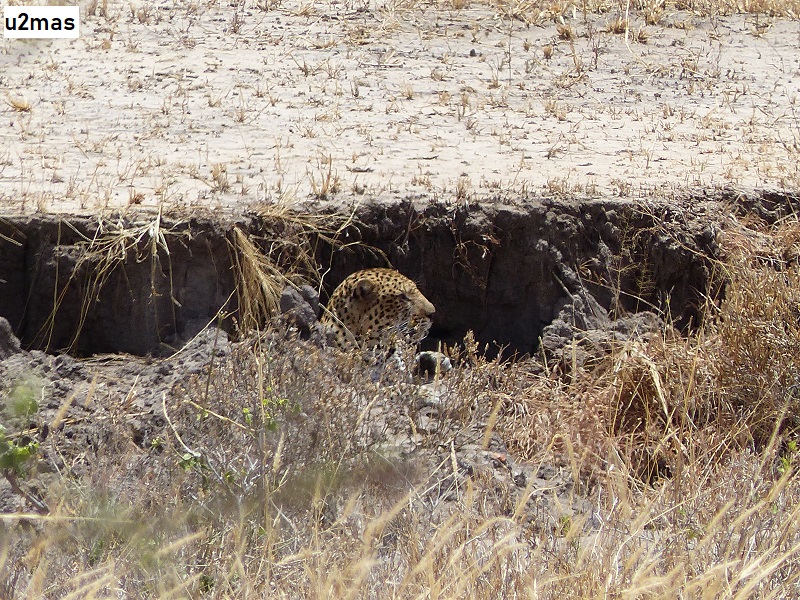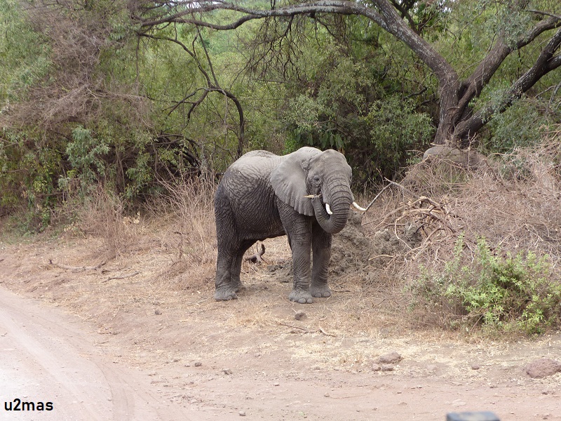 Yendo hacia el norte avistamos multitud de animales que se acercaban al río, que en esta época del año lleva poca agua y está a la espera de que aparezcan las lluvias. Entre ellos destacaron los búfalos, impalas, ñus, avestruces, jirafas, cebras, elefantes con crías y un tipo de antílope enorme que todavía no habíamos visto, el eland. Con más vegetación por la humedad del suelo seguimos avanzando, cruzándonos con un grupo de leones que descansaban a la sombra y un escurridizo leopardo, que con la paciencia adecuada, pudimos ver bastante bien. Como apunte, durante la visita a este parque hubo menos coches y turistas que en los previos. Comimos en las instalaciones del acceso principal, cercano a la carretera, del picnic preparado y con elefantes, mangostas y monos no muy lejos del mismo.
