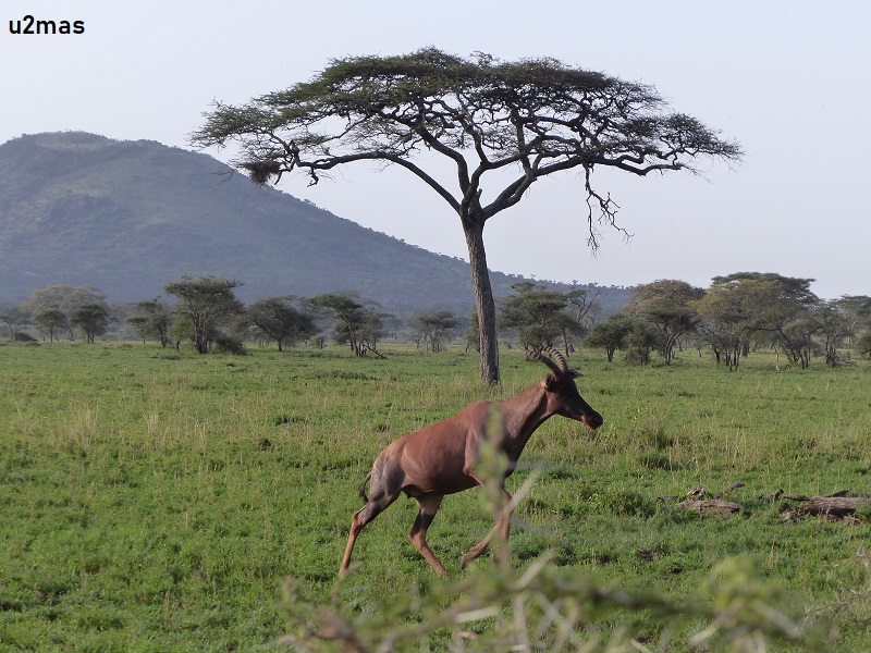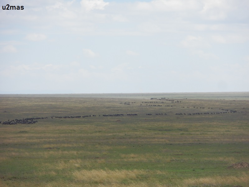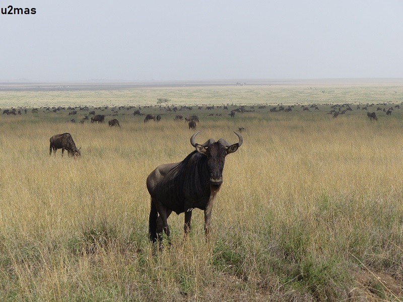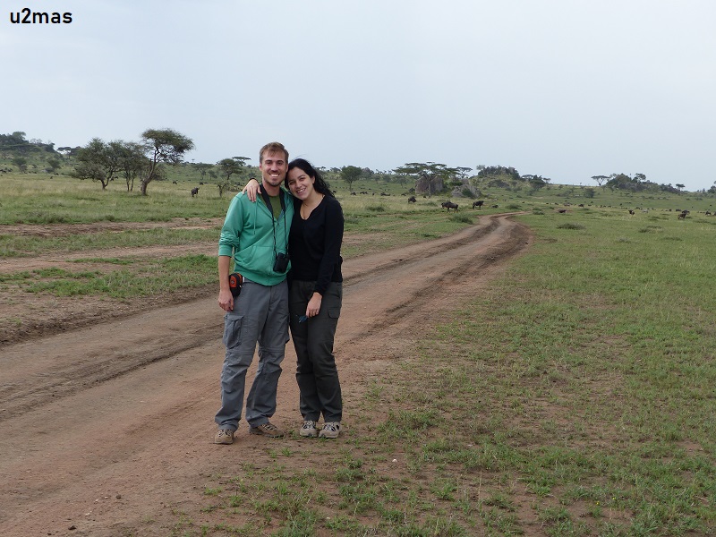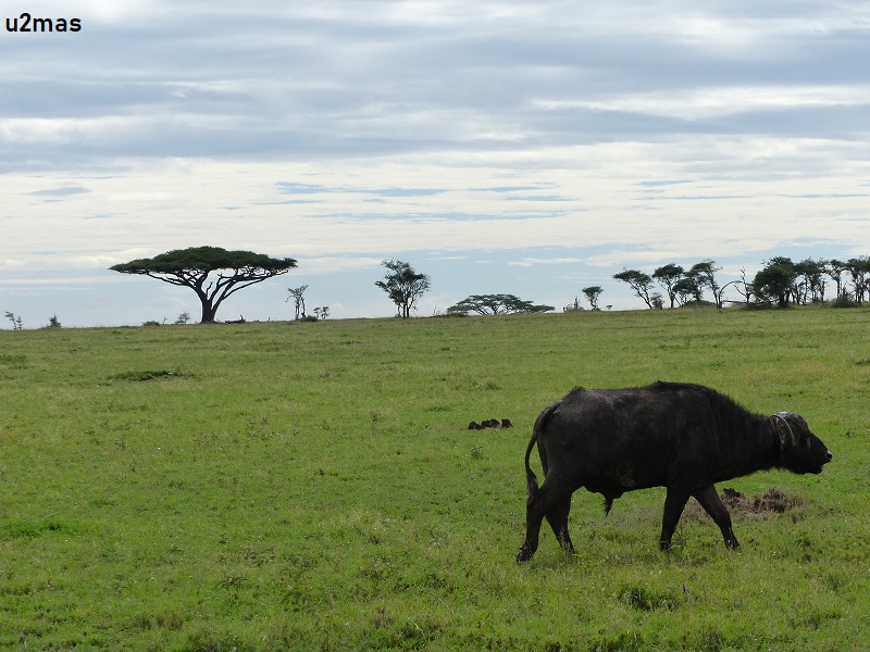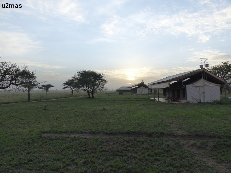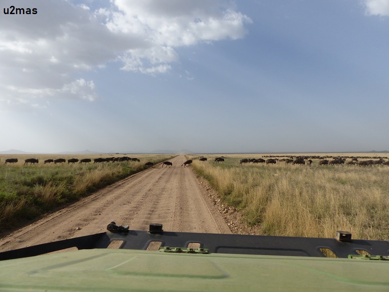 Durante la noche se dejaron oír los característicos ruidos de las hienas, que no andarían muy lejos, pues las tiendas están en mitad del parque. Además, si se quiere salir de la misma por la noche por algún motivo, se debe avisar con una linterna al vigilante correspondiente, que por seguridad suele ir armado con alguna carabina, o como pasó en otro de los alojamientos, con arco y flechas. Así pues, tras madrugar, ver el amanecer con ñus a lo lejos y desayunar muy bien, nos pusimos en marcha sobre las 8:15 horas con el día nublado y fresco.