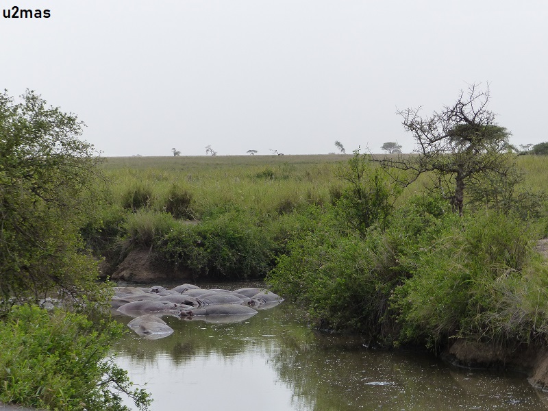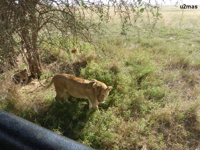 No sé cuántos kilómetros haríamos ni por qué zonas exactas, pero por la mañana estuvimos siguiendo el río Seronera, divisando bastantes animales que todavía no habíamos visto, como hienas, facóceros, mangostas o el dik-dik, un tipo de ciervo muy pequeño. Igualmente, hipopótamos en el río, los grupos habituales de herbívoros como gacelas, ñus, búfalos, cebras y antílopes y también varios tipos de aves como buitres, avestruces, marabús o el curiosísimo pájaro secretario. En cuanto a los carnívoros, tuvimos un espectacular avistamiento de un grupo de leones, que gracias a la paciencia y buen hacer de John, acabaron viniendo a tumbarse junto al árbol en el que paramos, observándolos bien de cerca. Un poco más lejos y encaramado en un árbol avistamos un leopardo, siendo fundamental, o al menos recomendable, llevar unos prismáticos y una cámara con un buen zoom, para una mejor experiencia en este tipo de viaje.