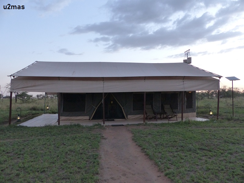 Entre un paisaje más húmedo y una mayor vegetación, tanto de arbustos como árboles, avistamos avestruces, búfalos, monos y más jirafas y elefantes, llegando pasadas las 18 horas al Serengeti Bush Camp. Este alojamiento, a unos 70 kms de la entrada al parque, consiste en unas tiendas bien asentadas y equipadas con su habitación y baño, con mosquitera en la cama y un peculiar sistema de agua caliente, en el que hay que avisar para que un empleado vierta el agua previamente calentada (al fuego) en el barreño correspondiente, que están en alto por fuera de la tienda. Por respeto, la ducha fue lo más corta posible, claro. Sólo dispone de electricidad por energía solar y wifi en la zona común y recepción y la comida, de nuevo, fue excelente, cenando hoy sí en compañía de John.