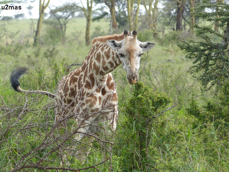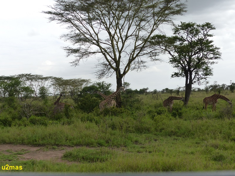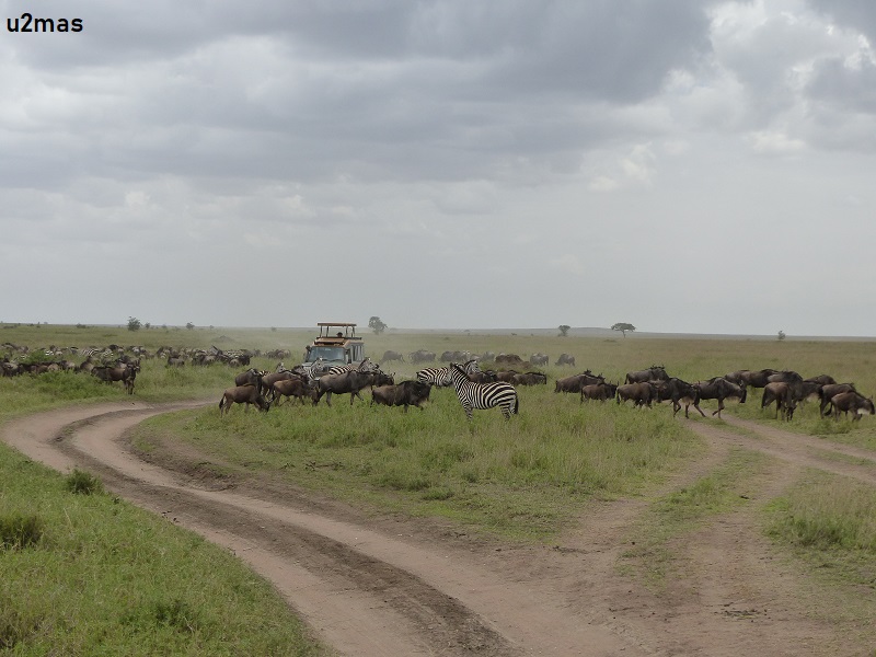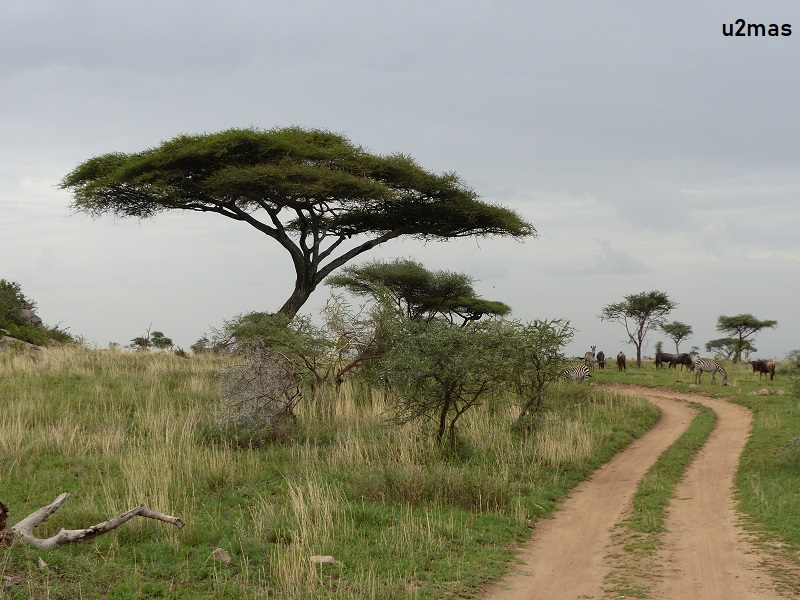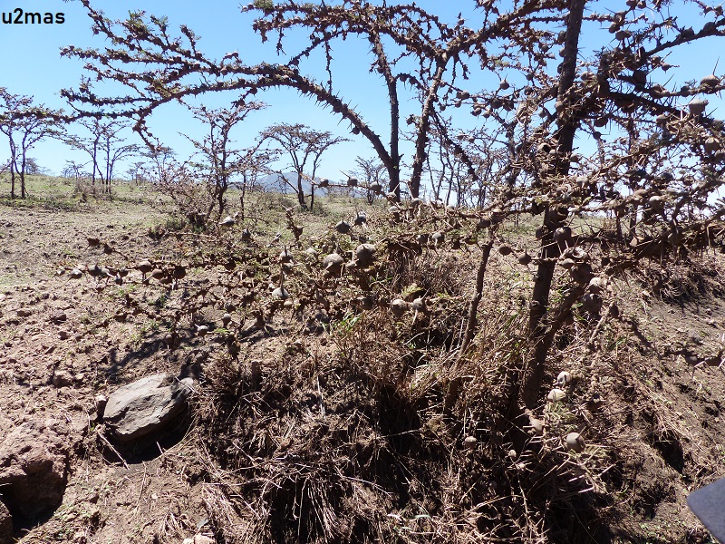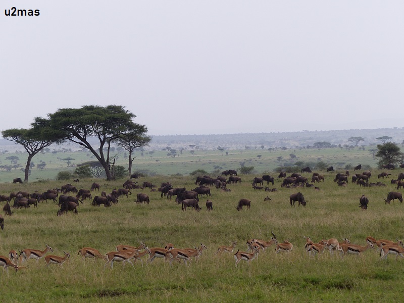 En el mirador también nos detuvimos, disfrutando de las espectaculares vistas a uno y otro lado, sobre todo del propio cráter. A partir de ahí fuimos bajando algo y cruzando villas y rebaños de ganado de los masai, pues habíamos entrado de lleno en una de sus zonas de influencia. El paisaje parecía una llanura interminable con algunos árboles sueltos, en las que ya había grandes manadas de animales herbívoros, y alguna franja con mayor vegetación, donde John nos enseñó un tipo de acacia cuyo fruto de usa como silbato, como curiosidad. Igualmente, el estado del camino permitía ir entre 60 y 80 km/h, que no está nada mal, demostrando nuestro guía buenas habilidades como conductor.