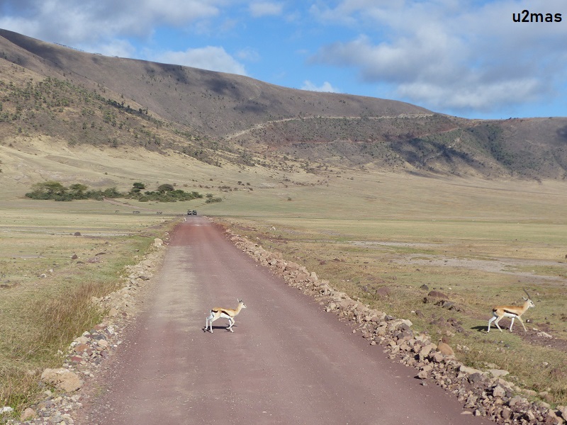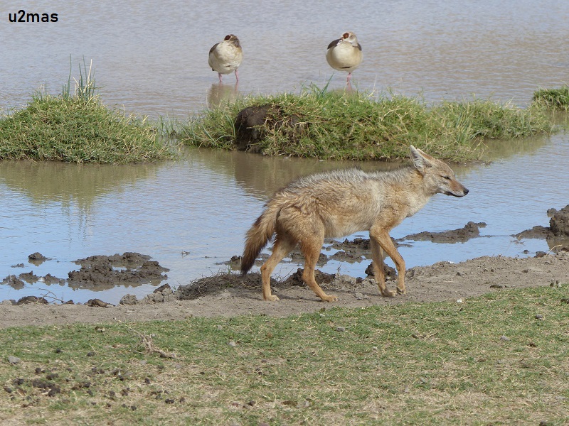 Iniciamos la ruta más pronto que otros días, a las 7, por lo que hubo que madrugar más para desayunar. La pista que entra al cráter ofrece unas vistas impresionantes, que mejoraron más si cabe con las nubes que quedaban paradas en las paredes montañosas. No tardamos mucho en llegar abajo, empezando por la parte oeste del cráter, donde se encuentra la masa principal de agua, el lago Magadi. Enseguida tuvimos los primeros avistamientos de cebras, gacelas, facóceros, hienas, elefantes y leones a lo lejos y un animal no visto hasta el momento, el chacal. A estas alturas habíamos visto casi de todo, apenas nos quedaba el rinoceronte, probablemente el más difícil por los pocos que quedan, sabiendo que en el cráter era posible hacerlo.