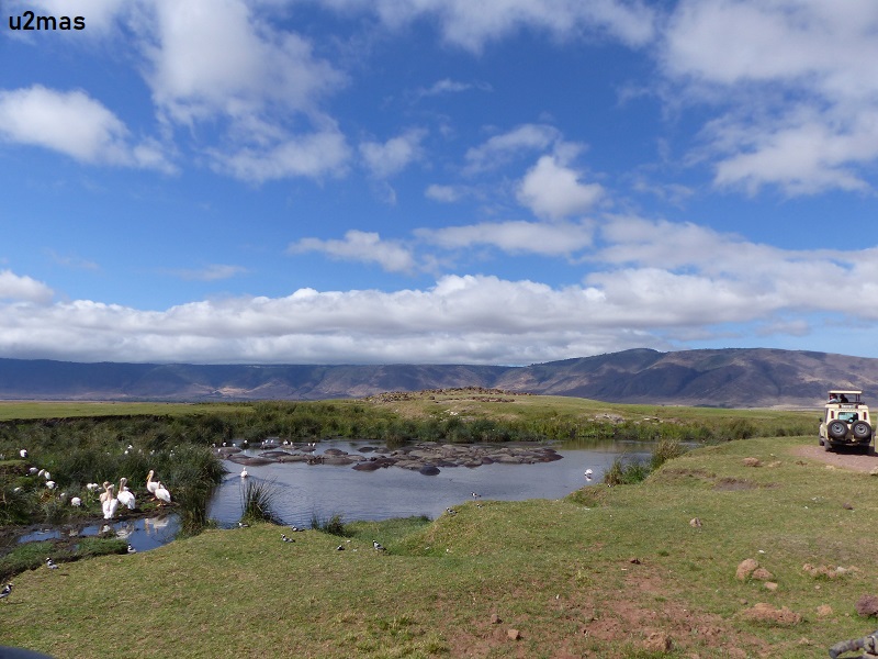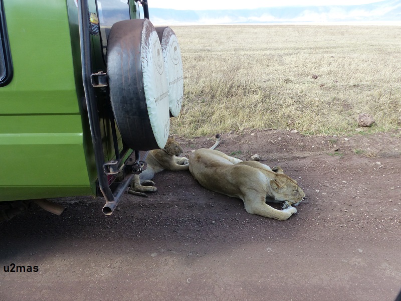 Nos fuimos desplazando hacia el centro y norte del valle, destacando grandes manadas de herbívoros, la piscina de hipopótamos, los pelícanos y el jaleo general que se montó debido a un ataque de hienas en grupo que se llevaron una cebra por delante, lo normal por estas tierras vaya. También aquí vimos leones muy de cerca, de hecho, aprovecharon la sombra de los 4×4 para descansar un rato, y como es lógico tienen prioridad. A continuación nos movimos hacia el sureste, donde hay otro lago, llamado Ngoitokitok, y una zona de bosque, comentando que tanto en este lago como justo al bajar al valle están los dos espacios con baños habilitados existentes en el cráter.