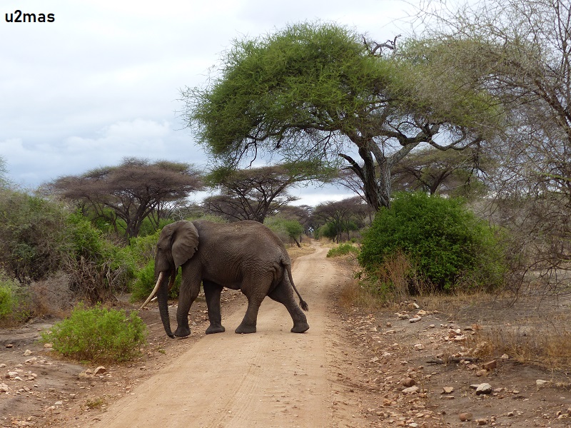 Accedimos al Parque Nacional de Tarangire por el sur del lago Burungi, ya que el alojamiento quedaba más cerca y así el recorrido sería más lógico para el día siguiente, hacia el norte y encarando Arusha, final de trayecto. El terreno pasó a ser considerablemente más seco, aunque con vegetación, cruzándose sobre todo elefantes antes de llegar al hotel sobre las 16:30 horas. Nuestra última noche de safari sería en el Tarangire Simba Camp, próximo a la entrada al parque, con cabañas-tiendas impecables, mosquitera en la cama, baño con agua caliente, electricidad y wifi en la recepción.