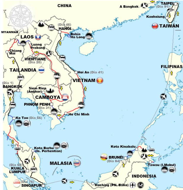 Itinerario: lo mejor ver el mapa adjunto, empezando desde Bangkok hacia el norte, para continuar hacia el sur tras unos dos meses una vez que volamos desde Hanói.
