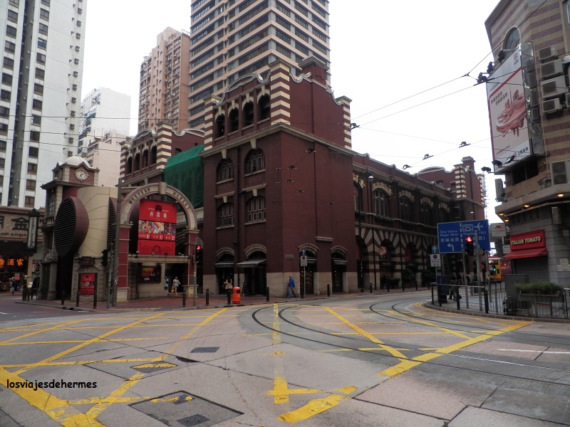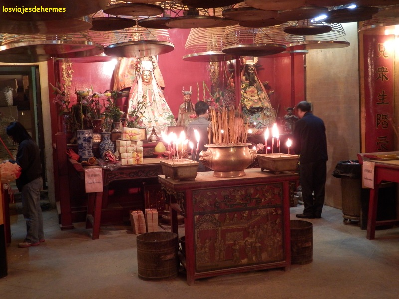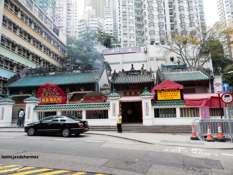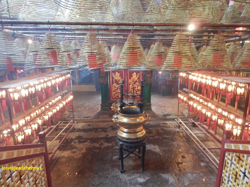 Con la sensación de estar como nuevo, desayuné y me puse en marcha. Empezaría la jornada en los barrios de la ciudad que están en la isla de Hong Kong, al norte, que es la parte urbanizada, yendo en metro desde Fortress Hill a la parada de Sheung Wan, la última de la línea Island, pagando con la Octopus card. Era sábado, estaba nublado y el día era un poco desapacible, factores que quizás influyeron para que no hubiera mucha gente, paseé por la zona viendo en primer lugar el bonito edificio colonial de principios del siglo pasado del Western Market y de allí al mercado de antigüedades de Cat Street que por desgracia no estaba montado. En Hollywood Road visité el templo chino de Man Mo (gratis), uno de los más antiguos de la ciudad y que me gustó especialmente, escondido entre altos edificios como estaba e inundado por completo de incienso, lo que le daba un toque muy oriental, deteniéndome a observar a los fieles que por allí pasaban.