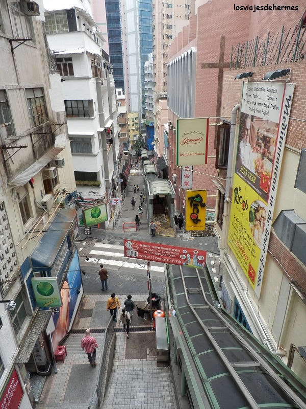 La siguiente parada fue el curioso mercado húmedo de Graham Street, llamado así porque el pescado lo mantienen vivo en recipientes de toda clase, ya en el barrio de Soho, al igual que la escalera mecánica más larga del mundo que cruza por completo esta zona que se va empinando hacia el Victoria Peak con sus 552 metros de altitud. Comentar que la escalera mecánica es sólo para subir, existiendo otra normal al lado para bajar (o subir haciendo deporte, claro). Aproveché para tomar algo en uno de los muchos bares y restaurantes que saturan esta zona y que abarcan casi todas las cocinas más conocidas del mundo. En este punto ya me había percatado de los impresionantes andamios de bambú típicos de Hong Kong, creando un contraste enorme entre los modernos edificios en construcción con esos andamios alrededor, que si bien parecen endebles, dicen que son de lo más seguro.