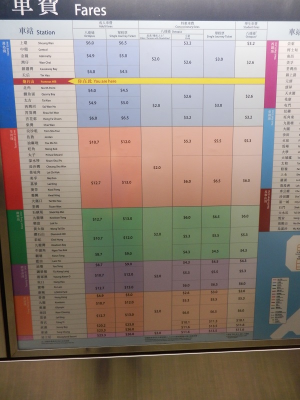 Teniendo en cuenta que el billete del aeropuerto al centro costaba 100 HKD=11,67 € y la tarjeta incluía un trayecto (no valía para la vuelta) me salía rentable. Tras dar estos pasos me dirigí al centro por fin, saliendo de la isla de Lantau, donde está el aeropuerto, entrando en la península donde está la ciudad (al sur, hasta aquí el metro iba en superficie) y llegando a la estación Central que se ubica en la isla de Hong Kong que es donde están los edificios más altos.