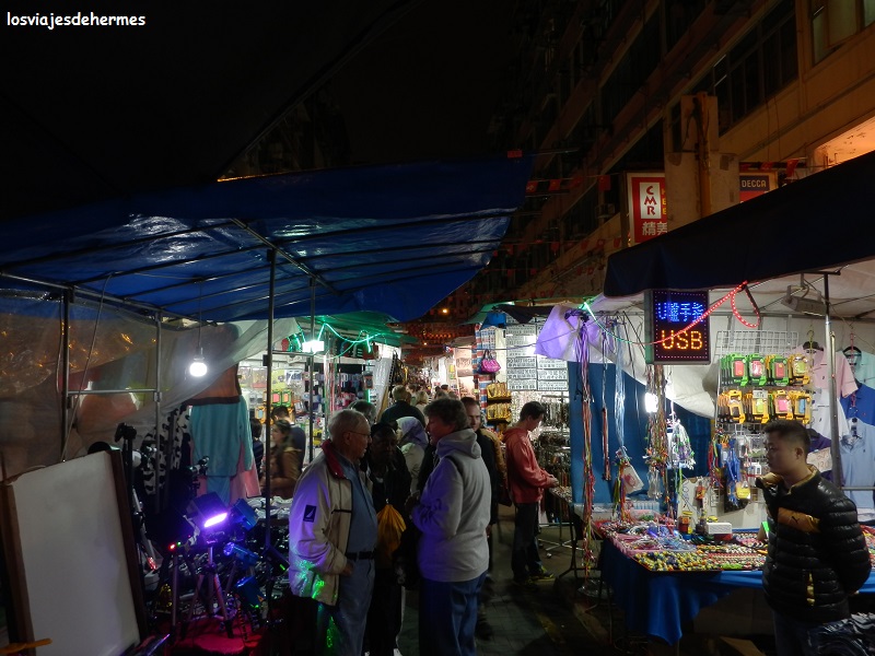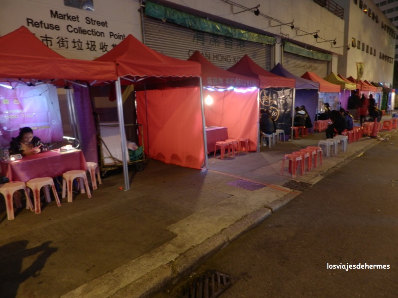 A continuación, fuimos a la terminal de ferries para cruzar al otro lado (3,40 HKD=0,41 € por cabeza al ser domingo), pasear de nuevo por el paseo marítimo de Tsim Sha Tsui con la Avenida de las Estrellas y las vistas nubladas por segundo día consecutivo, recorriendo después la calle Nathan hacia el norte (está llena de tiendas y comercios de todo tipo) hasta llegar a otro punto fuerte que me faltaba por ver, la zona de Temple Street. Nos centramos en el interesante y animado mercado nocturno, donde es posible encontrar casi de todo, particularmente lo que más me llamó la atención fue una zona de pequeñas casetas con gente que adivinaba el futuro de todas las maneras imaginables, como leyendo la mano o con cartas entre otras, la verdad es que no me animé a probar suerte y me conformé con curiosear por los puestos.