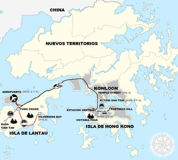 Itinerario: centro de la ciudad e isla de Lantau (ver mapa).
