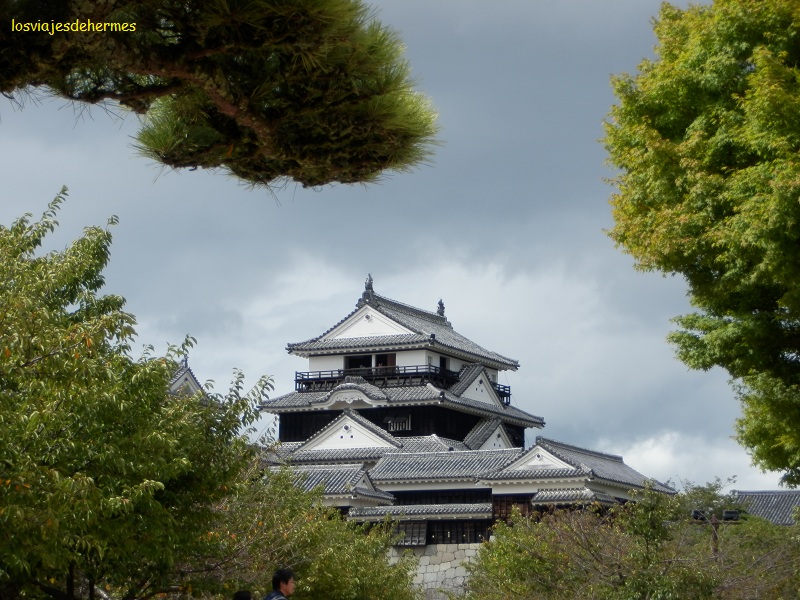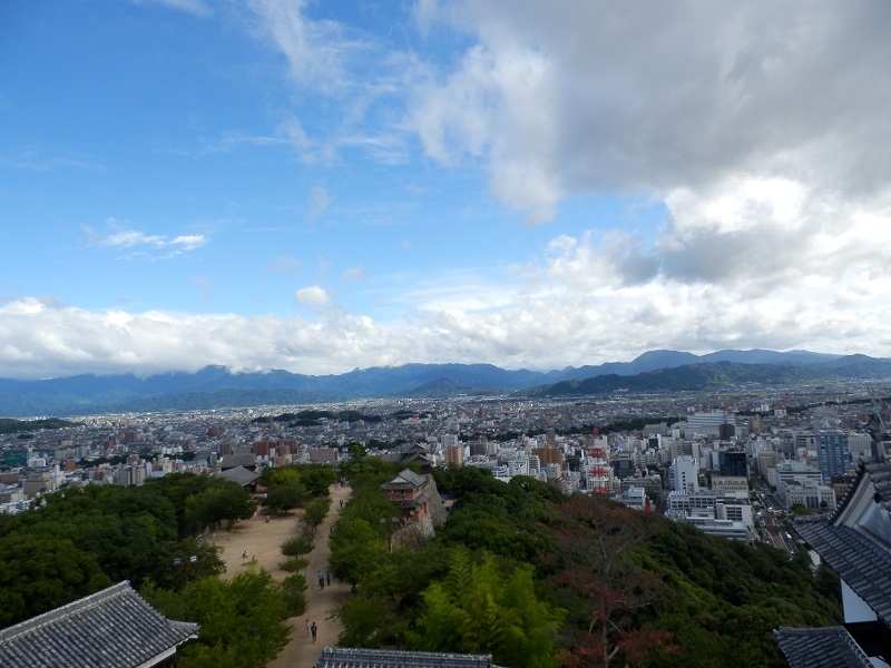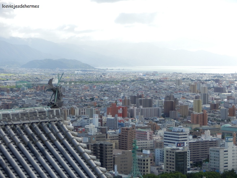 Empezamos por el castillo (cerraba a las 17 h), cogiendo el tranvía 5 hasta la parada de NTT (servicio de correos) y andando al camino de subida, que está sobre una colina en el centro de la ciudad. Para ahorrar algo de tiempo utilizamos el teleférico (i/v por 500 ¥=4,92 €), con opción de elegir entre las cabinas normales o unos telesillas individuales (por los que nos decidimos) sin barras de protección que nunca habíamos visto.