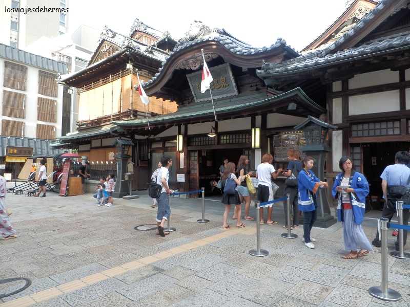 Para llegar a la zona del onsen cogimos el 5 hasta la última parada (Dōgo onsen), necesitando ayuda para encontrar el albergue Sen Guesthouse, en concreto un hombre que apenas sabía inglés nos acompañó a una cercana oficina de información e introdujo el problema en japonés, y ya nos indicaron (otro 10 en amabilidad). Dejamos las cosas en el albergue (chek-in a partir de las 15 h; recomendable ver el plano para llegar en internet, pero está a no más de 10 minutos andando desde la parada de tranvía) y comiendo un okonomiyaki enorme (especie de tortilla) para los dos por 1020 ¥=9,87 € en un local cercano. Ya en el albergue un americano que estaba en la recepción nos dio un mapa y toda la información práctica sobre lo que ver y hacer, otro 10 para él.