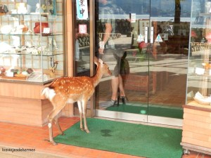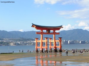 Para ir a la isla hay varias compañías y una de ellas es JR, por lo que es el único ferry que entra en el JR Pass, tardando apenas 10-15`en llegar. La primera imagen desde el barco es la del famoso torii flotante que indica el acceso al santuario de Itsukushima desde el mar, que es una de las imágenes más típicas de Japón. El tiempo era excelente y había mucha gente como era de esperar y también ciervos que como en Nara se mezclaban tranquilamente con los visitantes.