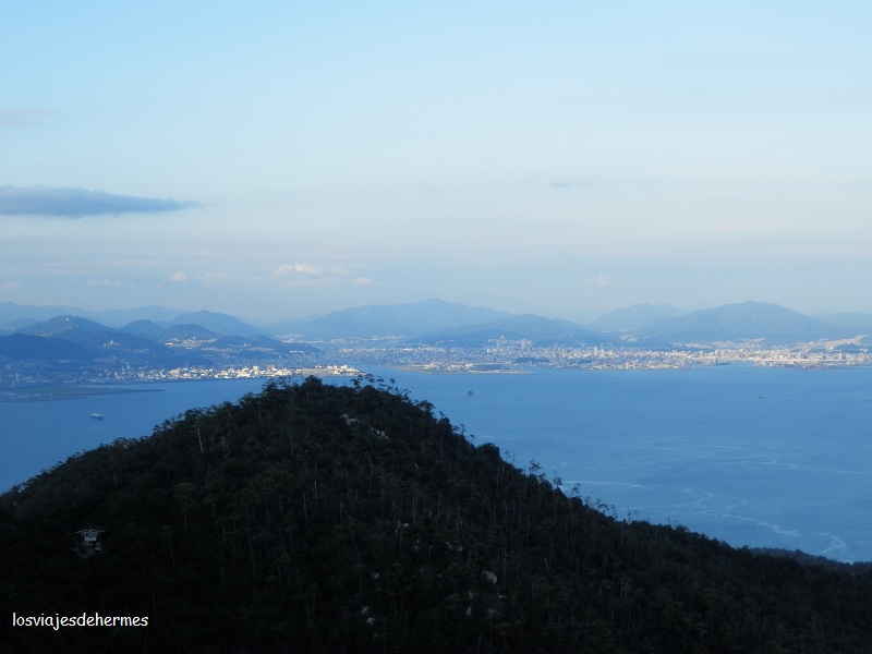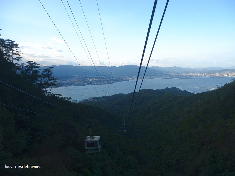 Primero se sube en una cabina que no caben más de 4 personas hasta la estación intermedia de Kayadani, donde se coge otro más grande y desde el que hay una buena panorámica, hasta llegar a la terminal de Shishiiwa. Desde aquí a la cima hay que andar un poco, pero junto a la estación hay un mirador que permite ver toda la bahía y la ciudad de Hiroshima y donde no nos importó pasar un buen rato. Luego subimos al templo Reikado, a medio camino de la cima, y como estaba anocheciendo y las vistas desde la cima no serían muy diferentes de las de la terminal del teleférico, bajamos por el camino más corto que va al parque Momijidani (hay varias rutas, una de ellas pasa por el templo Daishō-in, aunque no teníamos tiempo) tardando más de una hora en cubrir los casi 2 km, teniendo cuidado pues apenas veíamos y con los sustos que nos dieron una culebra y un ciervo. Fue una aventura pero es mejor organizarlo bien y que no se haga de noche si vais andando y sin el material adecuado.