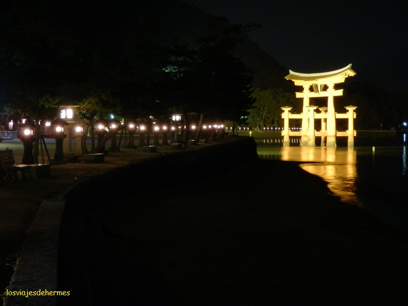 Hicimos alguna foto nocturna del torii y cogimos el ferry de vuelta (hay hasta pasadas las 23 h), comprando la cena y desayuno en Miyajima-guchi. El albergue Backpackers Miyajima cuenta con wifi y ordenador para uso común, baños y duchas, cocina más bien básica y las habitaciones de la 2ª planta están todas unidas con sus pasillos, pero sin puertas, salvo una que es sólo de mujeres. En nuestro pasillo había 8 camas en 4 literas, lo reservamos en hostelbookers y costó 2400 ¥=23,67 € cada cama por una noche. Los propietarios son encantadores.