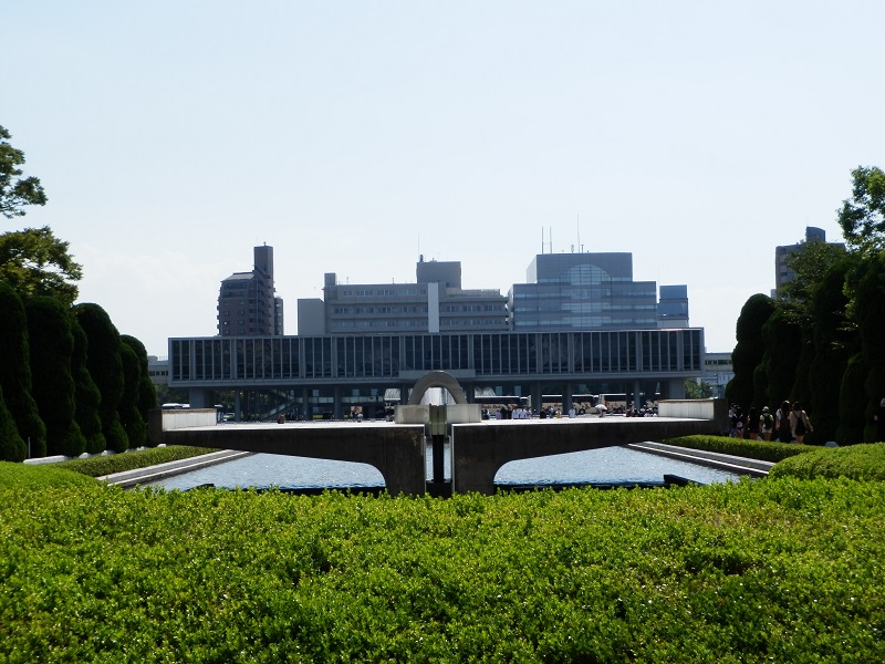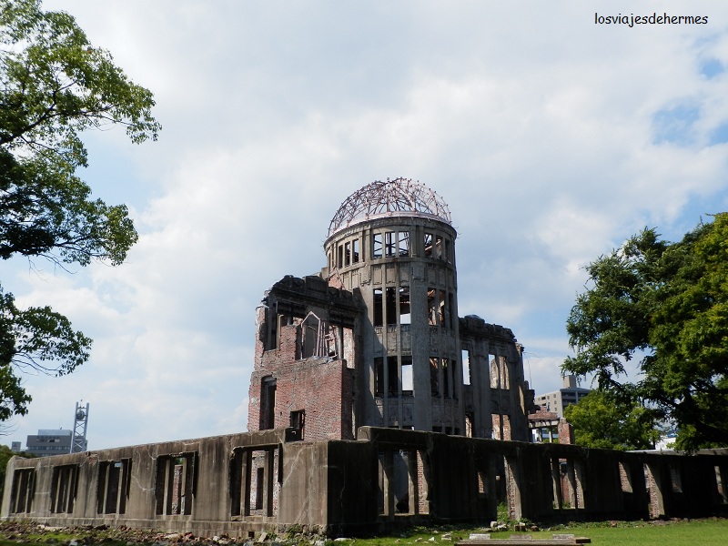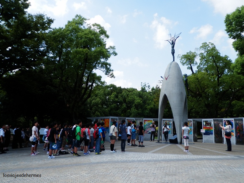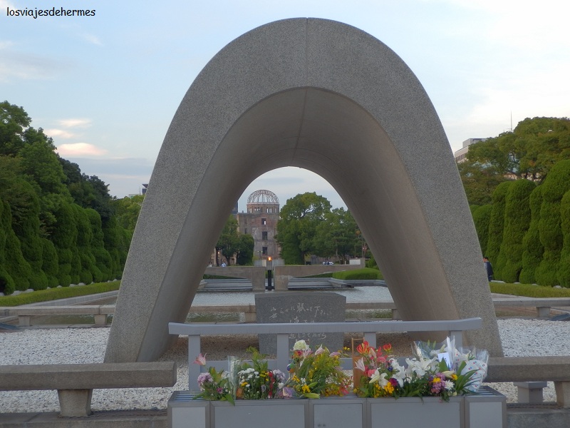 El Genbaku Dōme fue la cúpula del salón de Promoción Industrial y una de las pocas cosas de la que quedó algo en pie tras la bomba, se declaró Patrimonio de la Humanidad en 1996 y también se conoce por A-bomb dome. Pasear por la zona con los paneles explicativos que hay (también en inglés) y poniéndose en situación impresiona. De allí cruzamos el río para entrar al parque Conmemorativo de la Paz, un recinto cuidado al milímetro y con papeleras (y es que en otras partes de Japón es difícil encontrar papeleras y encima el suelo está limpio), donde se van viendo muchos pequeños monumentos a los niños (hay varias urnas con miles de grullas de papel), a los trabajadores de una empresa o a los muertos coreanos, por ejemplo. Alineada con las ruinas de la cúpula está la Llama de la Paz (se apagará si alguna vez no hay armas nucleares en el mundo) y el Cenotafio (que incluye los nombres de las víctimas conocidas). Pasamos junto a los dos museos que hay y que visitaríamos por la tarde.