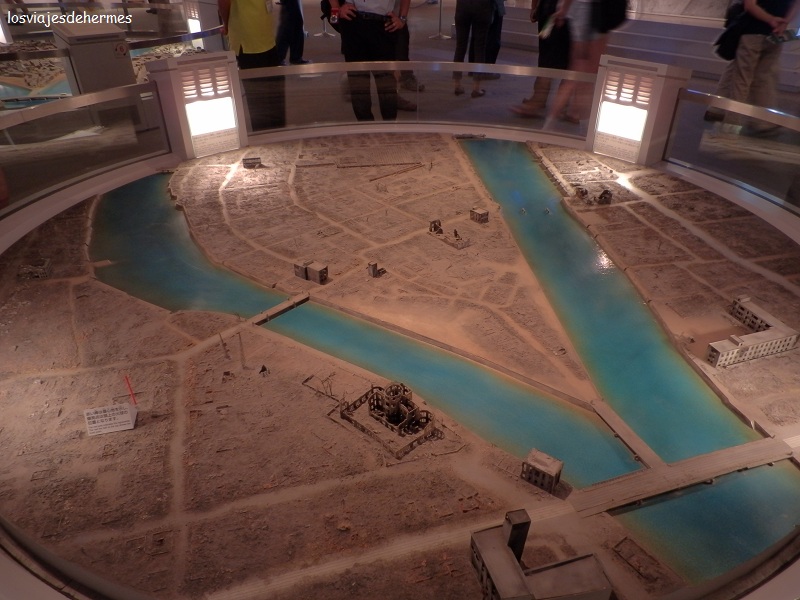 Después fuimos directamente a visitar el Museo Conmemorativo de la Paz (llamado también de la bomba) que cerraba a las 18 h, costando de forma simbólica 50 ¥=0,49 €, por lo que cogimos una audioguía en español por 300 ¥=2,95 €. El museo cuenta todo lo sucedido con fotos, maquetas, dibujos de supervivientes, exposición de objetos deformados como botellas, uniformes de personas e incluso malformaciones en uñas o la sombra de lo que fue una persona sentada justo en el lugar donde cayó la bomba, desde luego pone los pelos de punta y es sobrecogedor, pero pasó y es importante que esté ahí para que no olvidemos las consecuencias de las armas nucleares.