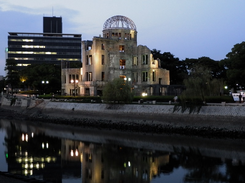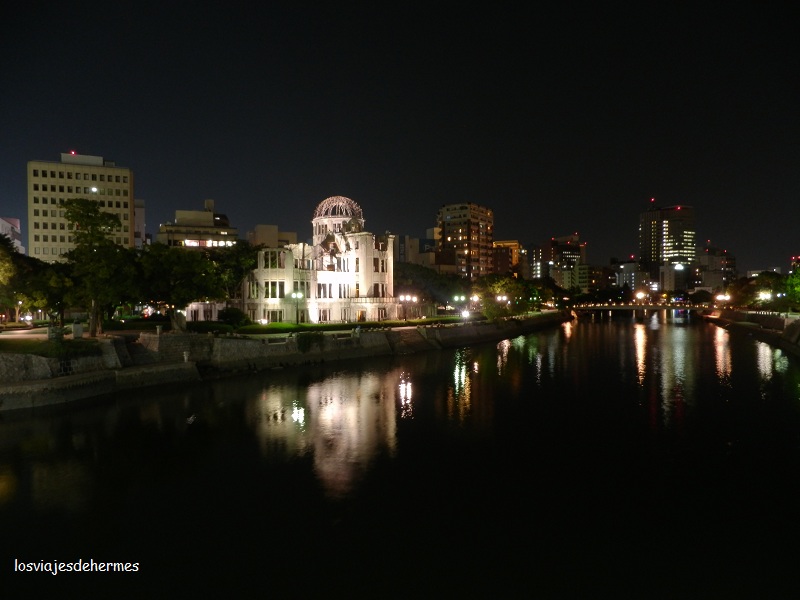 Ya de noche hicimos unas fotos muy buenas de las ruinas iluminadas que contrastaban con lo que el lugar simboliza, regresando a la estación JR (donde reservamos los trenes del día siguiente) con el tranvía 2 (150 ¥=1,45 €), y al albergue en Miyajima-guchi con el cercanías de la línea JR Sanyō reflexionando sobre lo que habíamos visto y preguntándonos si alguna vez podrán apagar la Llama de la Paz.