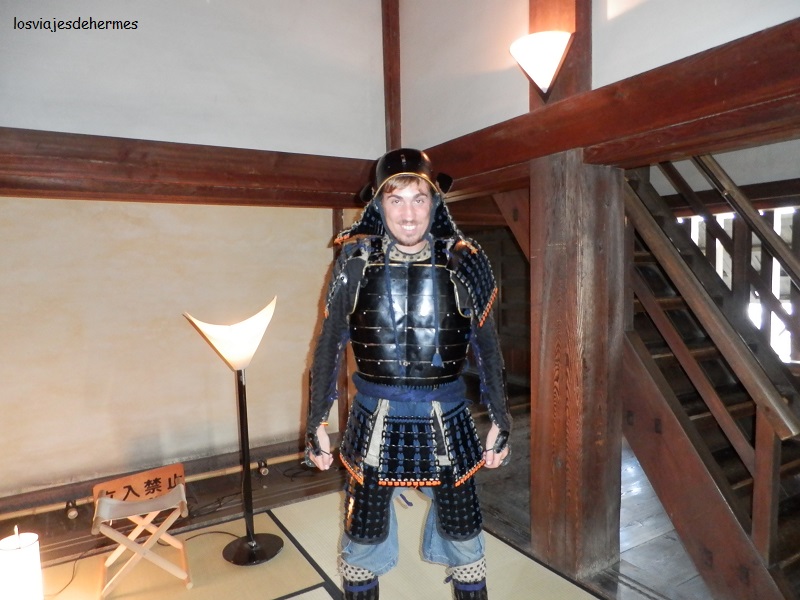 El castillo cuesta 500 ¥ pero nos salió a 400 ¥=3,94 € con un cupón de descuento que nos dieron en el albergue, y nos encantó. Tiene varias plantas, pudiendo acceder a la parte superior desde la que hay una magnífica vista de toda la zona y nos pudimos vestir de auténticos samuráis con unas armaduras que hay con sus paneles explicativos de cómo hacerlo, una buena experiencia en la que acabamos posando para todo el que pasaba por allí (no muchos se detenían a vestirse) e imaginando cómo podían luchar con semejante peso encima.