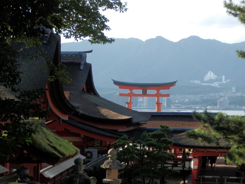 Hay que saber que Matsuyama queda casi enfrente de Hiroshima y hay ferrys rápidos que tardan hora y cuarto (6300 ¥=61 €) pero había que pagarlo, así que a exprimir nuestro JR Pass. Todavía nos quedaba un tren de cercanías de la línea JR Sanyō hasta Miyajima-guchi (casi media hora), pequeño pueblo donde teníamos el albergue y punto de partida de los ferrys a la isla de Miyajima. Al llegar a Miyajima-guchi buscamos el albergue, que está junto a la terminal de ferrys, dejando el equipaje hasta hacer el chek-in (de 15 a 22 h) y yéndonos a visitar Miyajima.