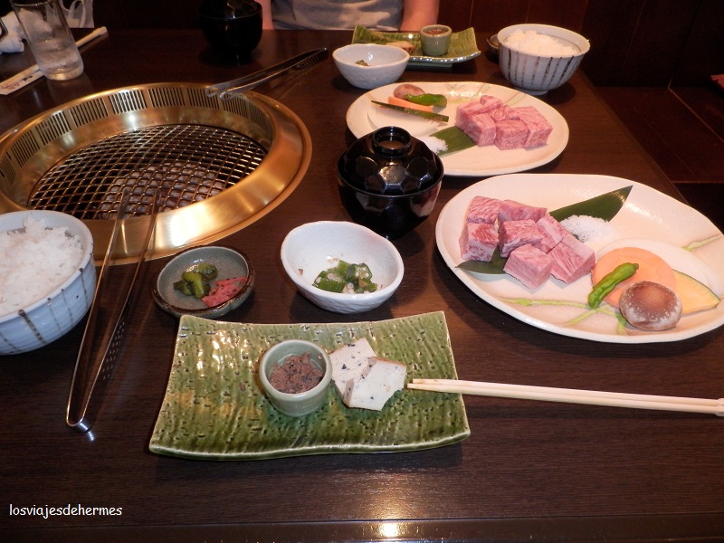 Elegimos el Maruaki, situado en la mencionada calle Kokubun-ji a la altura del templo Hida Kokubun-ji (al que no entramos, pero el recinto y su pagoda se ven desde fuera; la entrada es de 300 ¥=2,95 €), y fue todo un acierto. El menú consistía en unos cubos de carne de Hida (que nosotros mismos nos haríamos en la parrilla que la mesa tenía incorporada) y muchos acompañantes (verduras, un par de cosas que no sabíamos lo que era y por supuesto arroz), con el agua incluida y el postre (cosa que veíamos por primera vez) a un precio razonable de 2880 ¥=28,42 € cada uno, y desde luego es la mejor carne que hemos comida nunca, se deshacía en la boca, no sabemos cómo será la de Kobe pero con la de Hida acabamos encantados 😀 .