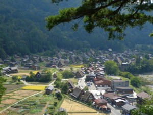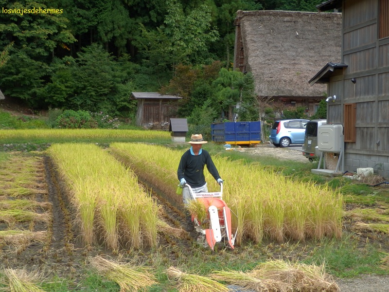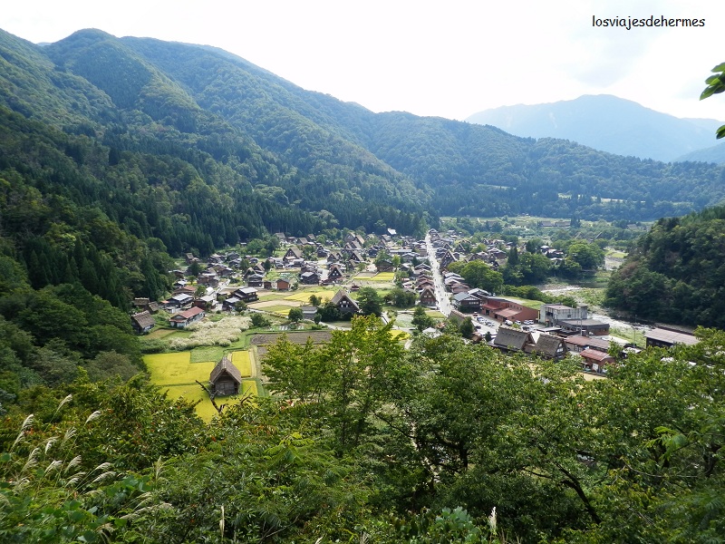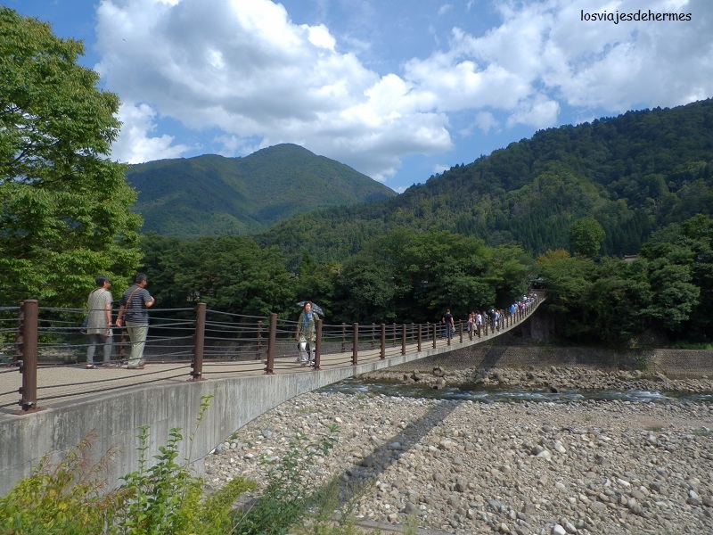 Lo cierto es que salimos a las 10:50 y a las 11:40 más o menos llegamos pasando por valles, túneles y puentes que no dejan indiferente. Con pasar unas 4 ó 5 horas se puede ver la aldea, cuya visita comienza cruzando un puente colgante desde la estación de bus. El lugar no es muy grande, recorriéndose con comodidad entre mucha gente, estanques con enormes carpas, campos de arroz y las cabañas con sus tejados de paja, algunas de dimensiones considerables, otras tienen tiendas y también las hay que se pueden visitar por unos 300 ¥=2,95 €.
