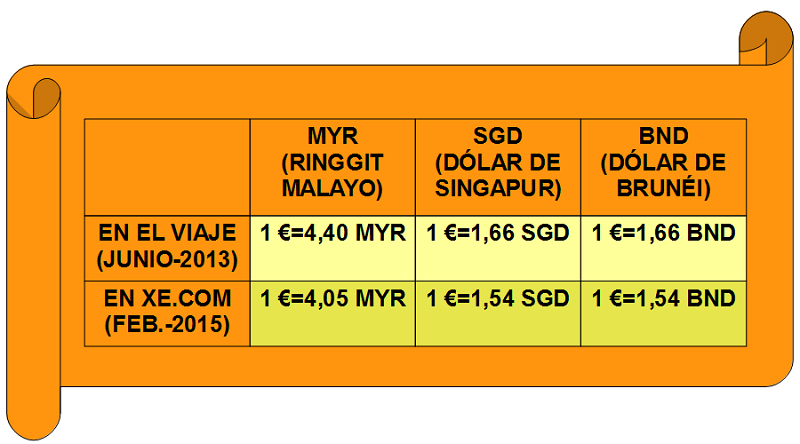 Cada uno de estos países tiene su propia moneda, dejando reflejado en el cuadro de al lado los tipos de cambio de cuando estuvimos (junio del 2013) y los actuales (febrero del 2015) a través de la web xe.com, éstos últimos serán los que queden reflejados para que los precios estén lo más actualizados posibles, pues como veis siempre cambian algo en poco tiempo.
