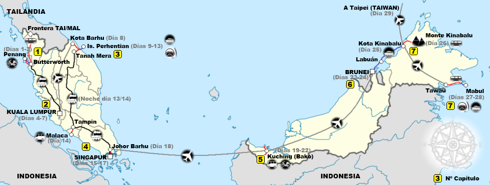 Itinerario: entramos por el puesto fronterizo de Bukit Kayu Hitam, que está al oeste de la línea divisoria entre Tailandia y Malasia para llegar a la isla de Penang en primer lugar. De allí a la capital, Kuala Lumpur y en avión a Kota Barhu como punto cercano al paraíso de las islas Perhentian. Continuamos por la ciudad colonial de Malaca, pasamos a Singapur y “saltamos” a la isla de Borneo desde Johor Barhu, visitando Kuching, el sultanato de Brunéi, Kota Kinabalu y Tawau, que es el aeropuerto más cercano al parque marino de Sipadán. Abandonamos Malasia desde Kota Kinabalu (conocida como KK) con destino a Taiwán, el último de los países visitados durante los 101 días que permanecimos en esta región. En total fueron 29 días (ver mapa).