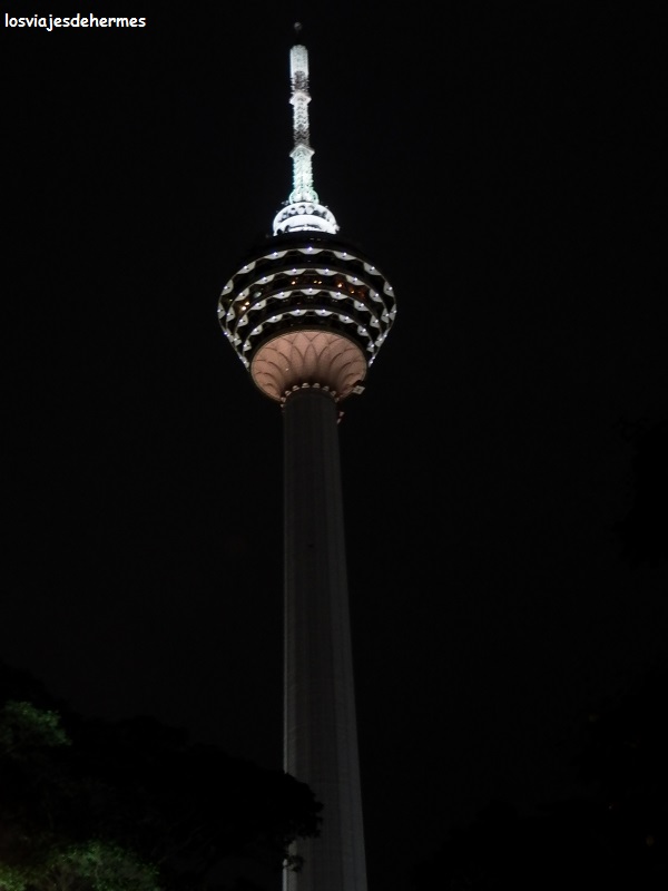 Nos propusimos volver de noche para ver el edificio iluminado, continuando nuestro recorrido del día hasta el animado barrio del Triángulo Dorado (bajando por las calles P. Ramlee primero y Sultan Ismail después), con muchos comercios aunque sin nada especial que visitar, además empezó a llover un poco aprovechando para comer allí en un restaurante indio por 16 MYR=3,94 € los dos y regresando al guesthouse cogiendo el monorraíl en Bukit Bintang hasta Tun Sambanthan por 1,80 MYR=0,44 € cada uno. Al atardecer y apenas sin lluvia volvimos a “nuestra” estación de monorraíl y nos bajamos en Raja Chulan (2,10 MYR=0,51 €) con la intención de subir al mirador de la Menara KL Tower, que está muy cerca de dicha estación, costando 47 MYR=11,58 € por cabeza, las vistas desde luego son buenas y lógicamente lo que más destacaba era las torres Petronas, comprobando la potente iluminación que tenían, si bien es cierto que nos gustaron más las vistas y fotos que conseguimos desde el parque del KLCC.