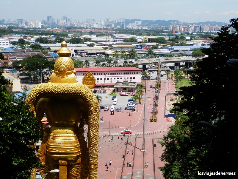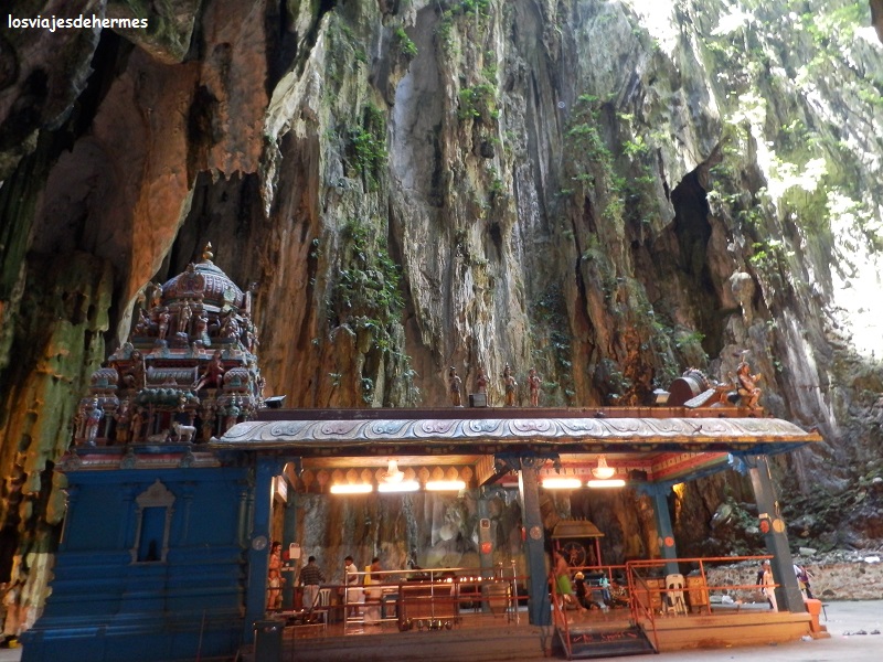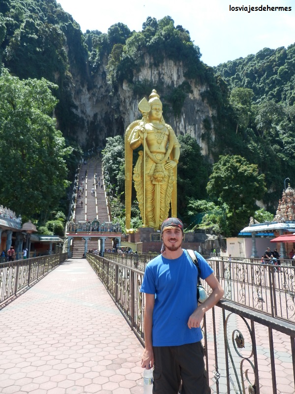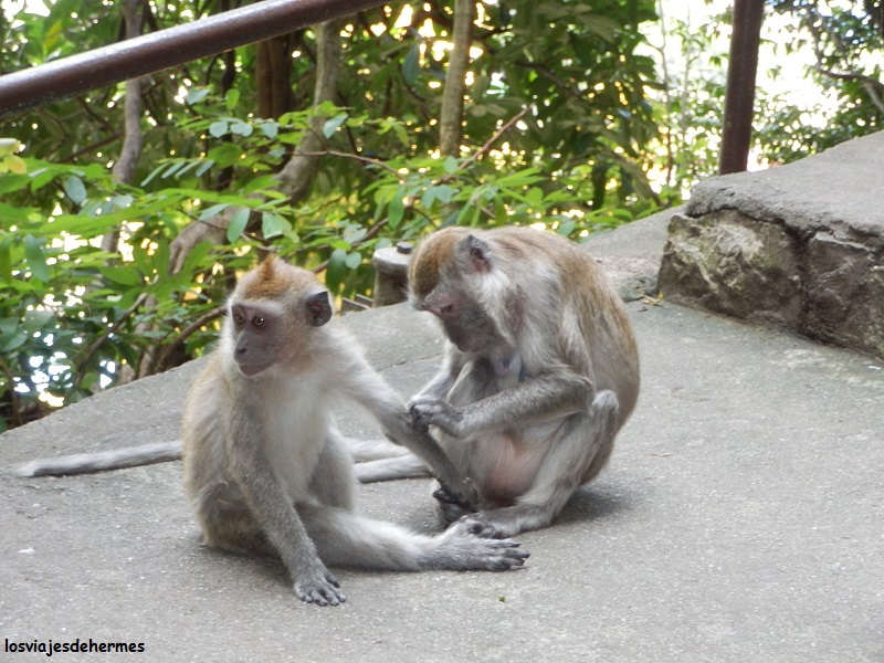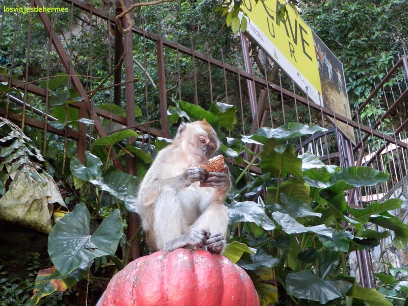 Una vez allí impresiona ver las enormes escaleras que ascienden junto a la estatua de la divinidad hindú Murugan, que preside el lugar, no tardando en aparecer los primeros monos jugando por las barandillas o en los árboles cercanos. Acceder a las cuevas era gratis y había bastante gente, pero tampoco es que estuviera abarrotada, comenzamos a subir hasta llegar a la enorme oquedad que hace de entrada, desde la que se apreciaba una buena vista de la urbe de Kuala Lumpur, con más monos por todos lados con los que también hay que tener cuidado, pues no será la primera vez que se llevan una cámara de fotos o algo, de momento vimos a algunos bebiendo de una botella de coca-cola que había por ahí tirada. Dentro y entre un olor un tanto fuerte vimos los santuarios y templos hinduistas y a algunos de sus monjes, haciendo constar que la visita es rápida y que con medio día basta para hacer la excursión.