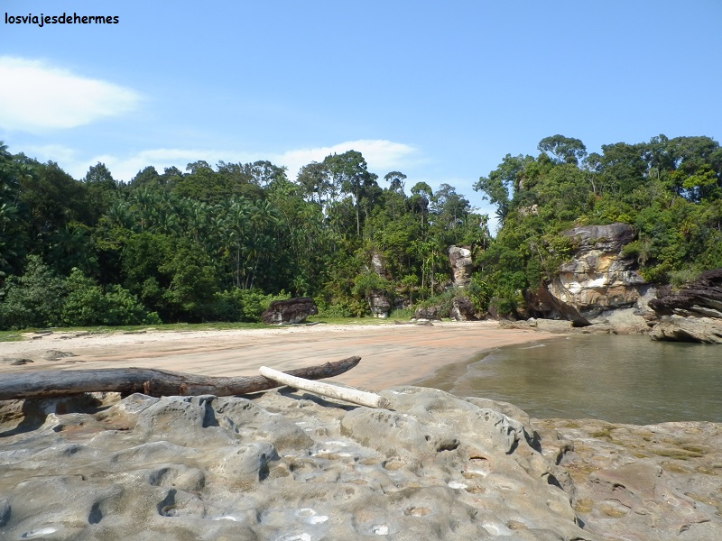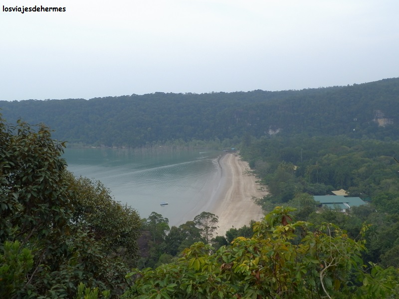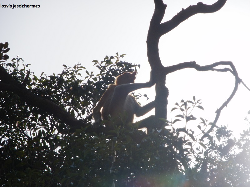 En poco tiempo salimos a mar abierto dirigiéndonos a la bahía de Teluk Assam, suponiendo una media hora de barco, y desembarcando en la misma arena, desde donde había unas preciosas vistas de las montañas que cercaban dicha bahía haciéndonos algunas fotos y despidiéndonos de momento de nuestros compañeros pues a las 4 de la tarde regresaríamos. En la misma playa se podían ver monos de cola larga y jabalíes barbudos rebuscando en la arena, y es que este lugar es privilegiado en cuanto a flora y fauna, siendo el animal estrella el extraño mono narigudo que tuvimos la gran suerte de encontrar.