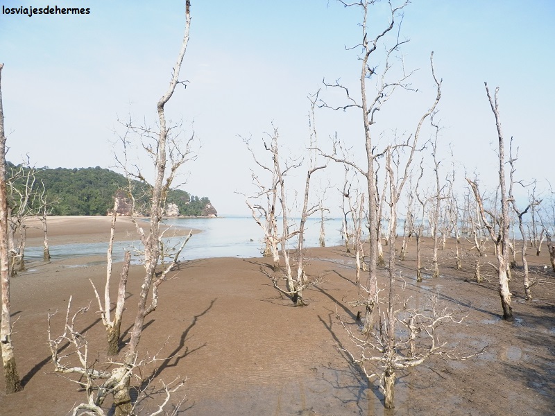Deshicimos el camino de la ida parando a tomar algo en nuestro alojamiento y cogiendo los bañadores, pues el día era muy caluroso, con un poco de bruma, poniendo rumbo a la conocida playa de Damai para pegarnos un baño. Esta zona quedaba a unos 32 kms al norte y llegamos bien sin perdernos gracias al mapa que teníamos, saliendo de la ciudad por el puente que cruza el río Sarawak al oeste y pasando junto al museo del gato para continuar por una carretera paralela al río Santubong, cruzándolo por otro puente antes de llegar a la pequeña península del mismo nombre. El recorrido fue muy agradable y lógicamente no teníamos prisa ninguna, al llegar dejamos la moto en el exclusivo “Damai Beach resort” y anduvimos hasta la playa de este, de libre acceso, donde nos relajamos, tomamos el sol y nadamos en un agua muy caliente.
