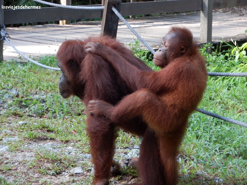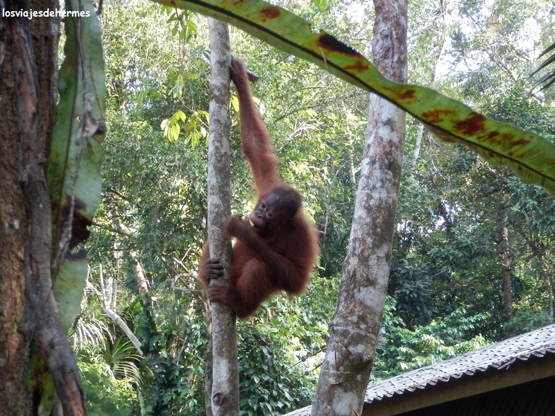 Éramos un grupo bastante grande de gente y puntuales a las 9 empezaron a poner la comida en las plataformas de madera que había entre los árboles, no tardando en aparecer los orangutanes, impresionando tanto el animal en sí como los ruidos que hacían (había que estar en silencio) y permaneciendo allí al menos una hora. En un momento dado varios de ellos bajaron y se fueron por una vereda donde pudimos verlos muy de cerca, los cuidadores hasta tuvieron que apartarnos, uno incluso se quedó sentado en una barandilla de madera un buen rato observándonos y quizás preguntándose qué es lo que hacíamos con una mirada muy expresiva, sin duda fue un gran momento. Este animal está en claro peligro de extinción y en reservas como esta viven en semi-libertad, ya que salvo estas dos horas al día en las que les alimentan están a su aire.