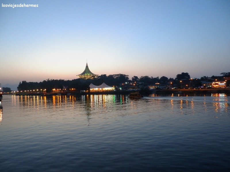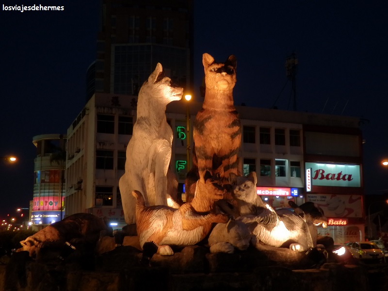 Al caer el sol salimos a cenar por la zona, haciéndolo en unos puestos por 12 MYR=2,95 € los dos y continuamos descubriendo el “waterfront” y su buen ambiente hacia el este, hasta llegar a una estatua de gatos que había junto a un par de centros comerciales, y es que este animal es venerado aquí -hay más estatuas y hasta tiene un museo-, porque Kuching en malayo deriva de “kucing” que significa gato. Sin prisas hicimos el camino inverso para ir ya a descansar encantados con esta ciudad de 600.000 habitantes, en la que nos encontramos muy cómodos desde el primer momento, tanto por lo tranquilo y agradable del ambiente en general como por lo bien que estuvimos y la ayuda que nos prestaron en el “Wo Jia Lodge”.