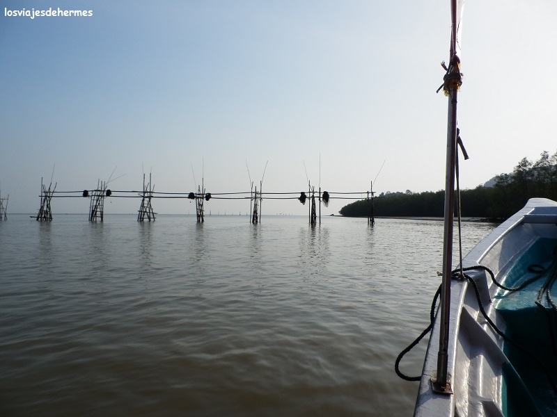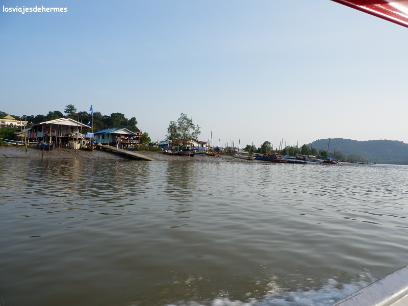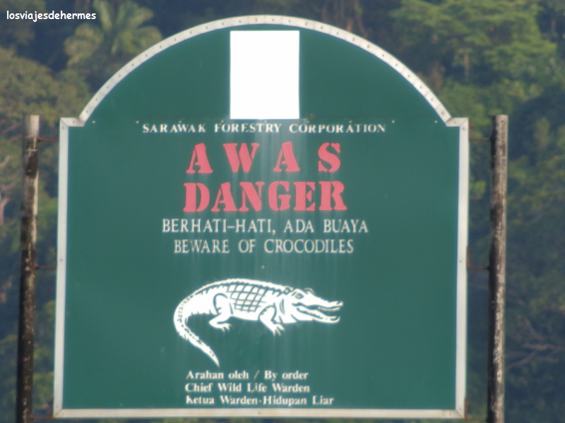 Los 27 km² de este parque nacional son inaccesibles por tierra, por lo que el bus o furgoneta te deja junto a la oficina del parque en Bako Bazaar, donde hay pagar la entrada de 20 MYR=4,93 € por cabeza y contratar el barco que lleva hasta la playa donde están las oficinas centrales, alojamientos y el restaurante del parque. Cuesta 94 MYR=23,17 € ida y vuelta (la mitad cada trayecto), hecho por el cual esperamos a la llegada del bus con la idea de compartir los gastos con alguien, pues el resto de pasajeros ya se conocían y formaban un grupo. El embarcadero da al río Bako, donde según varios carteles había que tener cuidado con los cocodrilos ya que había conocimiento de algún ataque. Llegó el bus y enseguida dimos con una pareja anglo-keniata que tenía el mismo problema, así que ya éramos 4 bajando el precio a 47 MYR=11,58 € cada pareja y saliendo enseguida a navegar por el río, cruzando los barrios construidos sobre el agua (“kampung”) y observando la vida cotidiana de sus habitantes ya fuera pescando o limpiando cosas en la misma orilla, con la marea baja.