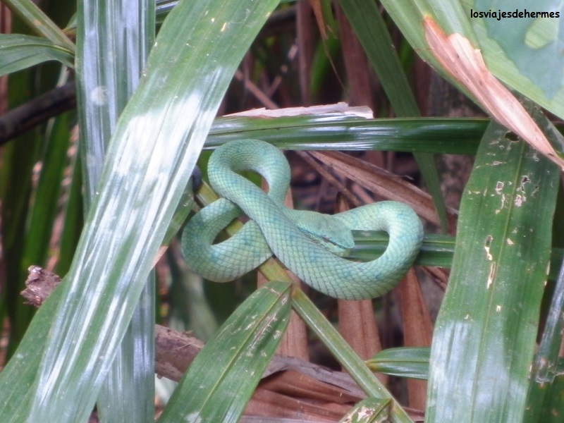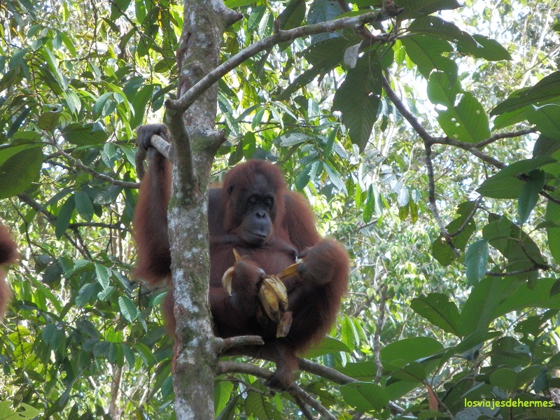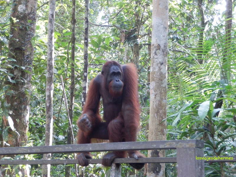 Éramos un grupo bastante grande de gente y puntuales a las 9 empezaron a poner la comida en las plataformas de madera que había entre los árboles, no tardando en aparecer los orangutanes, impresionando tanto el animal en sí como los ruidos que hacían (había que estar en silencio) y permaneciendo allí al menos una hora. En un momento dado varios de ellos bajaron y se fueron por una vereda donde pudimos verlos muy de cerca, los cuidadores hasta tuvieron que apartarnos, uno incluso se quedó sentado en una barandilla de madera un buen rato observándonos y quizás preguntándose qué es lo que hacíamos con una mirada muy expresiva, sin duda fue un gran momento. Este animal está en claro peligro de extinción y en reservas como esta viven en semi-libertad, ya que salvo estas dos horas al día en las que les alimentan están a su aire.
