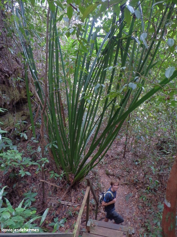 Lo primero es ir a la oficina central que tiene una breve exposición y paneles informativos con todas las rutas con su duración, dificultad y color identificativo (está muy bien organizado y señalizado), siendo obligatorio apuntar en un libro la hora de salida y ruta a realizar, y acordarse de poner la hora de llegada al acabar, claro. Lo malo de ir sólo un día es que hay que elegir senderos cortos, así que hicimos el T. Paku, cuya duración estimada era de 1 hora sólo ida, color de las marcas blanco y dificultad baja. El sendero salía al norte de la playa y luego giraba al oeste, sólo había que seguir las señales y las marcas de colores. Este era uno de los sitios donde se puede ver al mono narigudo, comenzamos caminando sobre unas pasarelas que cruzaban árboles que se inundaban en marea alta y luego, al girar al oeste, por una vereda más pequeña con ligeras subidas y bajadas y una vegetación muy frondosa, aunque sin ver monos por más atentos que íbamos, llegando al final a la playa Paku.